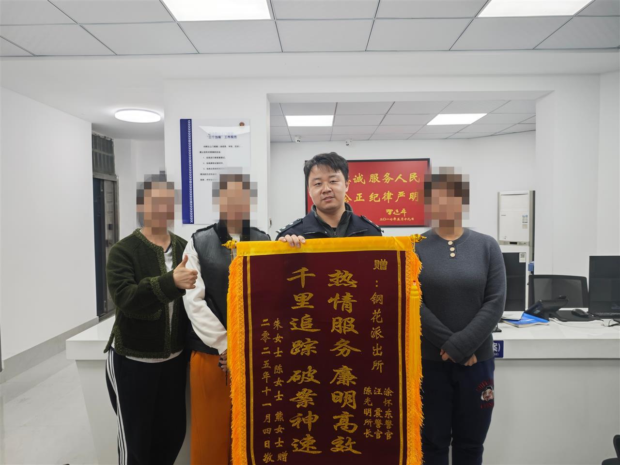 11月4日,三名受害人专程前往钢花村街派出所赠送锦旗,对民警高效办案、全力挽损表达感谢。