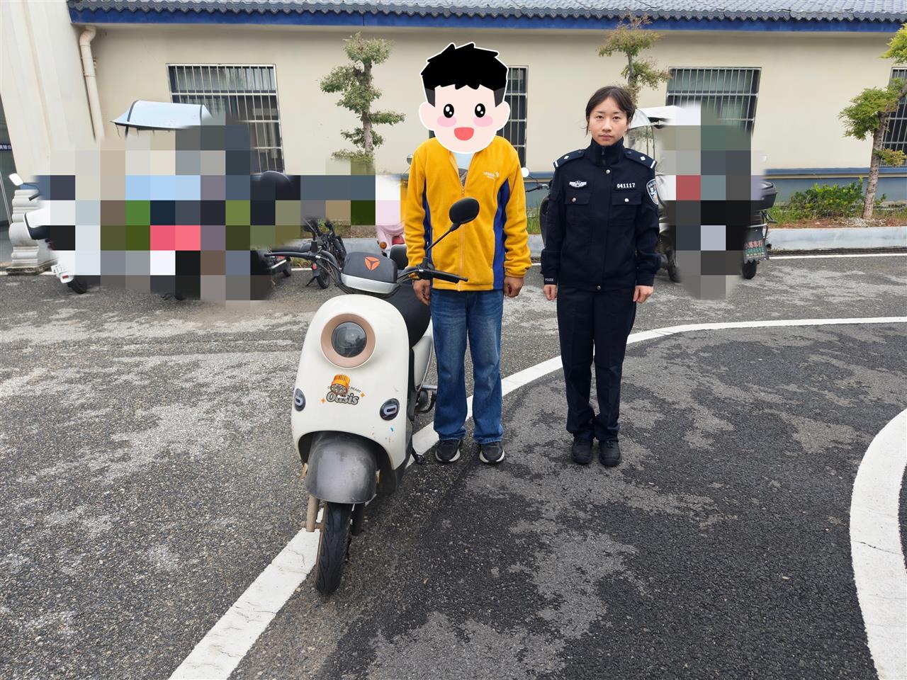 近日,武汉市黄陂区,参警3个月的新警黄灏钰锲而不舍,最终帮报警人成功找回被盗电动车(如下图)。