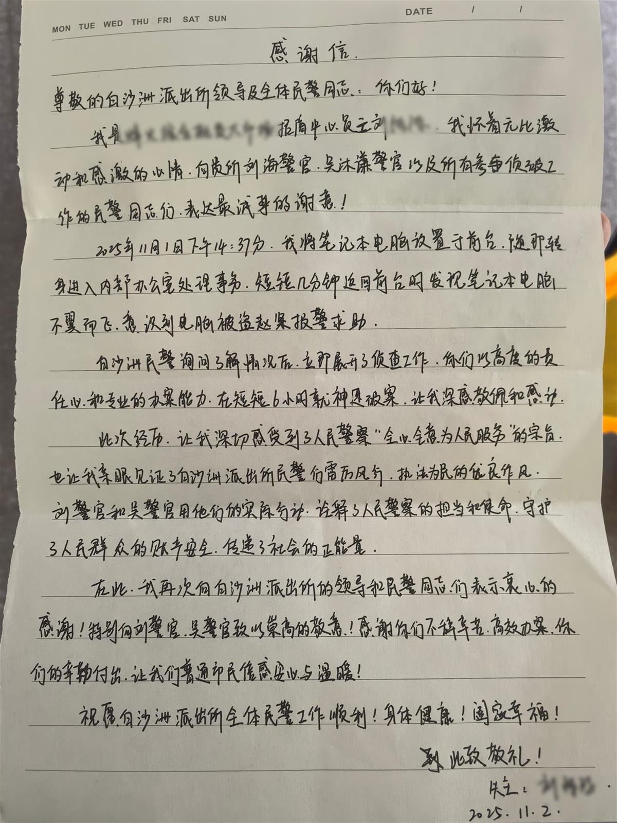 11月2日,刘女士带着手写的感谢信和锦旗来到白沙洲派出所表示感谢:“你们认真负责的态度让我们普通市民倍感安心与温暖。”