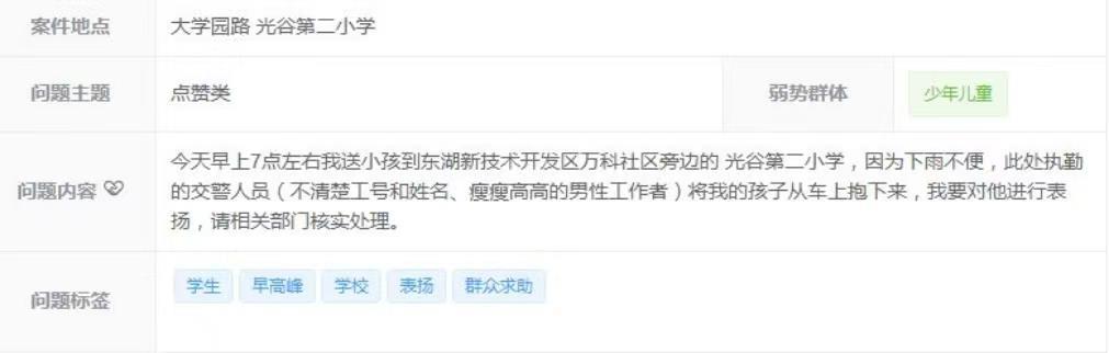 “看到他在雨里忙前忙后,不仅指挥交通,还一个个帮孩子送进学校,我心里特别感动!”11月6日,武汉市东湖高新区交通管理大队接到一位学生家长的表扬电话,电话中,家长动情地讲述了光谷二小门口发生的暖心一幕。