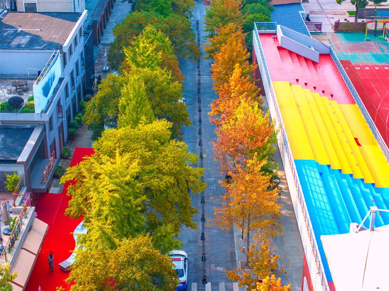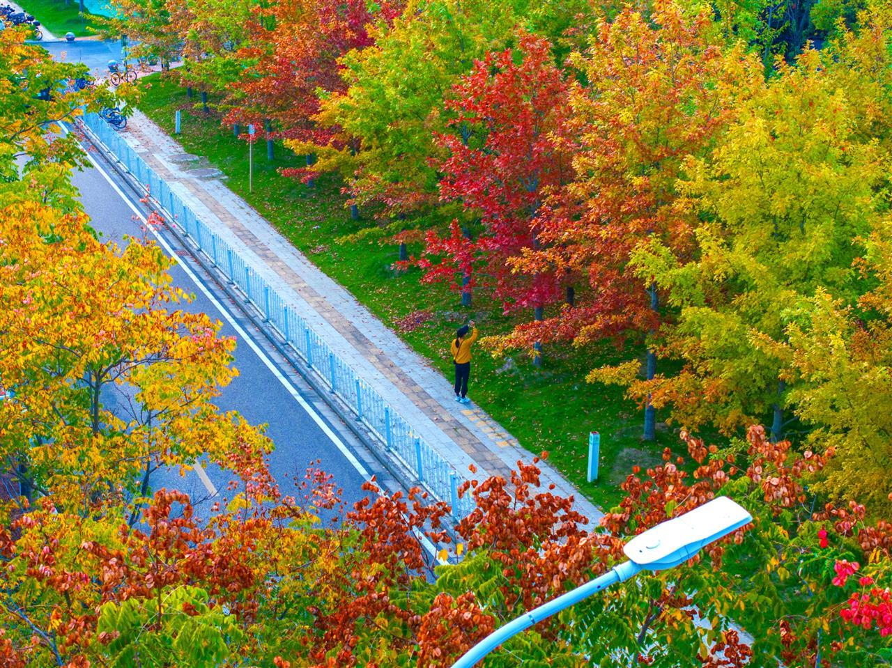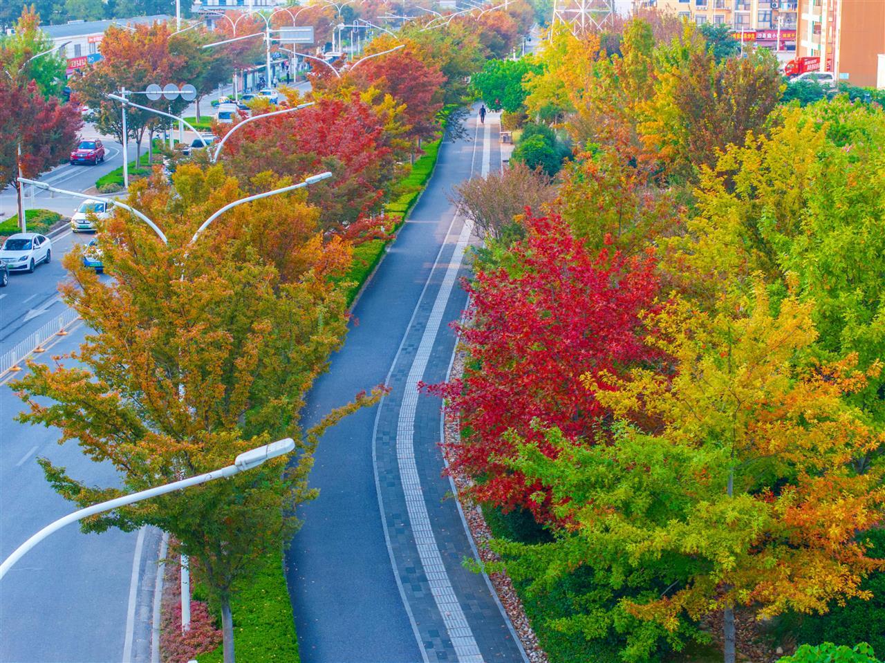 美国红枫以其明艳夺目的“红妆”装点着道路,与高大的法桐那金黄的叶片相互映衬,更与临江大道蓝色的专用骑行廊道串联起这幅美景,骑行其中,仿佛“车从画中过,人在景中游”,沉浸式体验城市浪漫。
