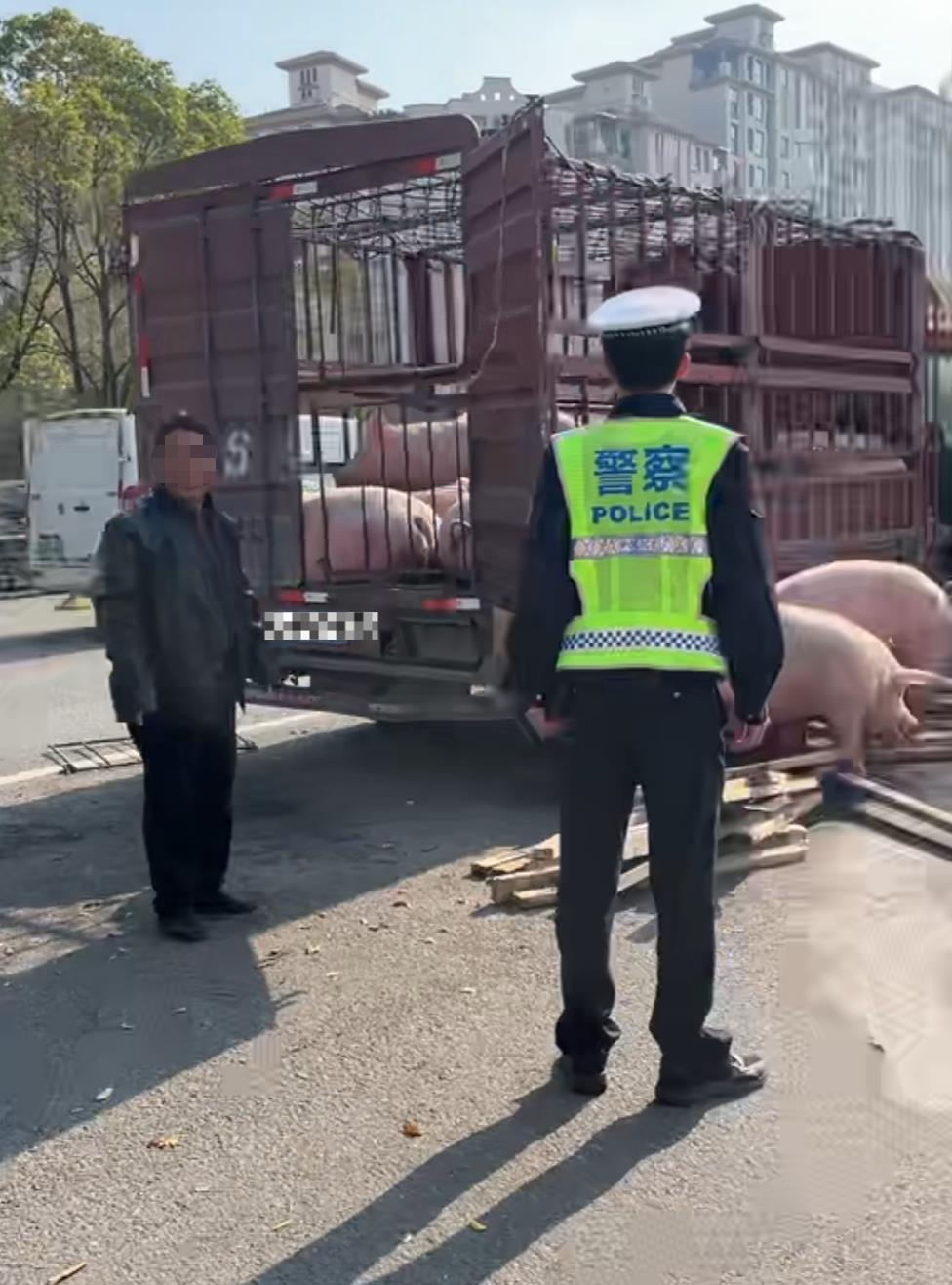 直至驾驶员联系的转运货车赶到,几人合力成功将生猪运上车,确认现场无安全隐患后,民警辅警们才放心准备离开,临走前还不忘叮嘱驾驶员:“一定要吸取教训,以后货物装载完毕后要将货箱的扣锁扣死,车辆检查无误后再上路行驶。可别再让‘二师兄’们偷偷‘越狱’啦!”