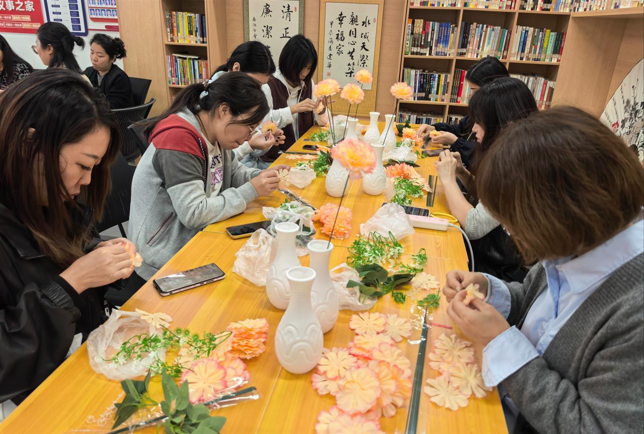 活动现场,社区工作人员提前准备了彩色皱纹纸、铁丝、花艺胶带等材料包。花艺师通过分步演示,教授大家如何将单张纸片折叠成花瓣,如何通过分层粘贴形成立体花型,并指导大家调整花瓣弧度与花蕊高度。“斜剪45度角能增加吸水性,摘除底部叶片可延长花期”,这些实用技巧让参与者迅速掌握要领。年轻妈妈们边制作边交流,有的将粉色花瓣与白色花蕊搭配,象征“青春永驻”;有的用红色丝带装饰花瓶,寓意“热情常在”。
