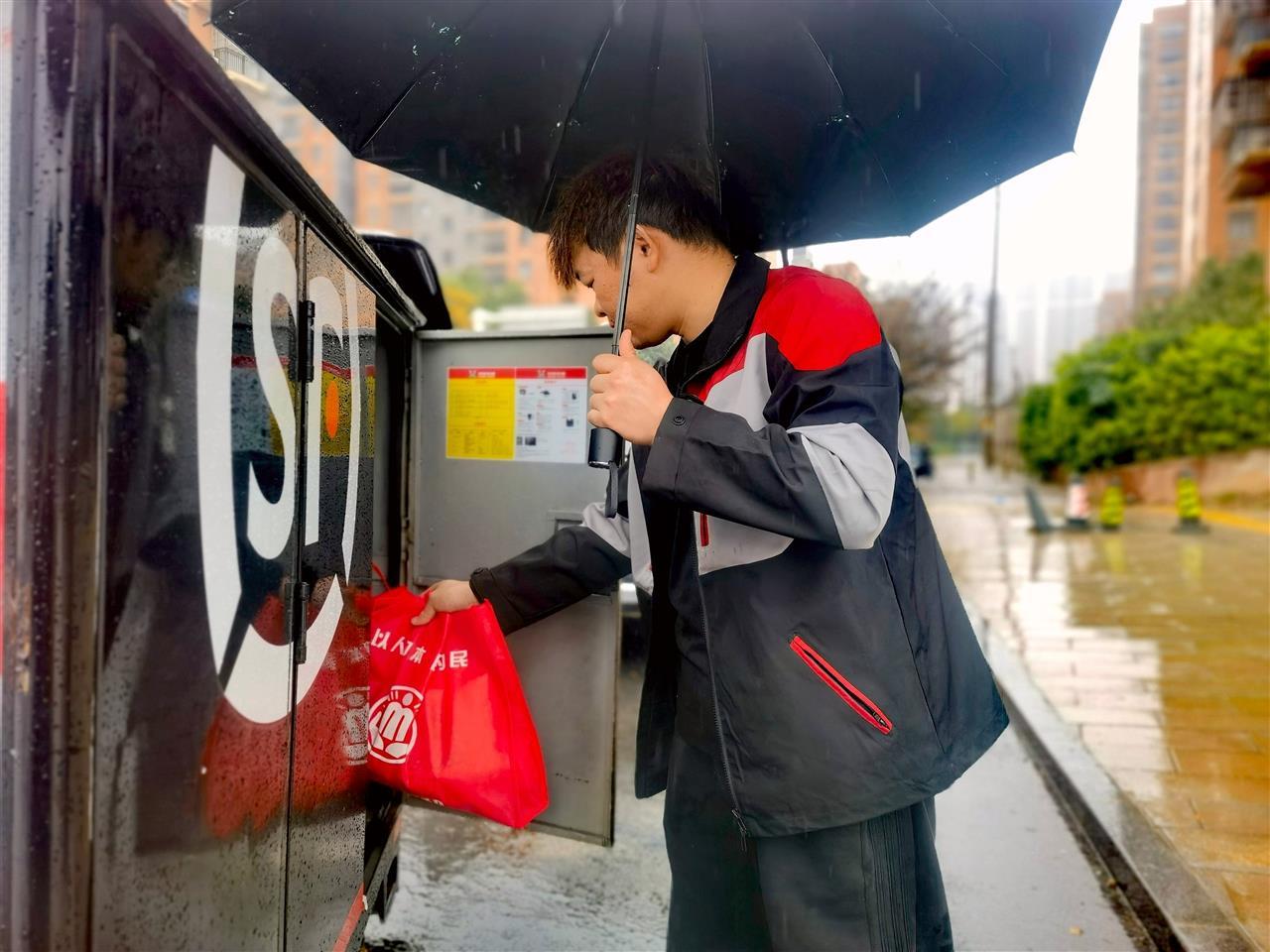 11月6日上午11时许,天空阴雨绵绵。快递小哥查青胜的身影出现在武汉东湖高新区佛祖岭街流芳社区的幸福食堂门口。
