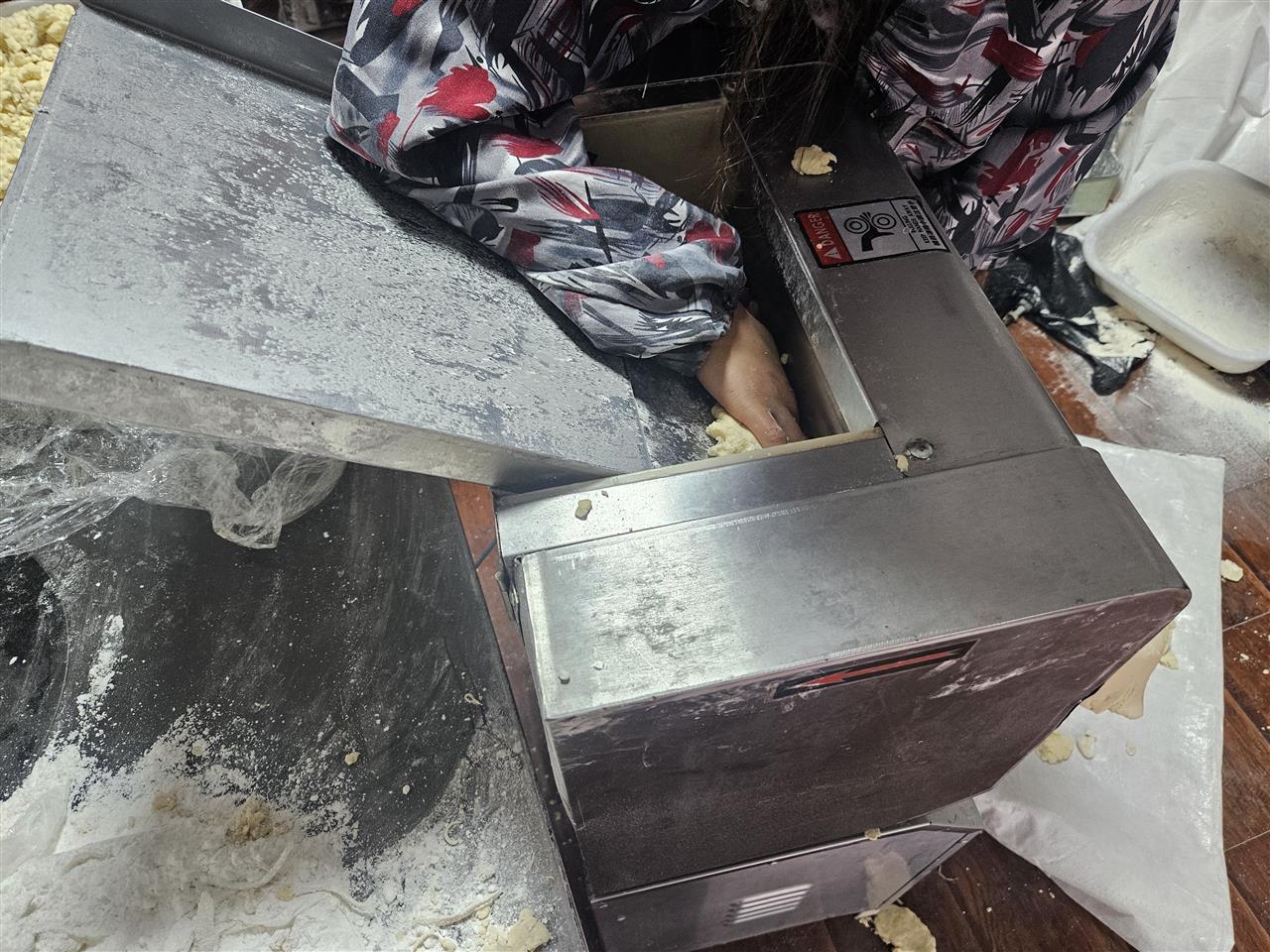 武汉消防提醒:操作类似压面机、和面机等带有滚轴、齿轮的机械设备时,务必保持高度专注,严格遵守操作规范,切勿因疏忽大意导致意外发生。一旦发生手部等部位被卡的情况,要冷静应对,切勿生拉硬拽,应立即切断电源,并第一时间拨打报警电话,等待专业救援。