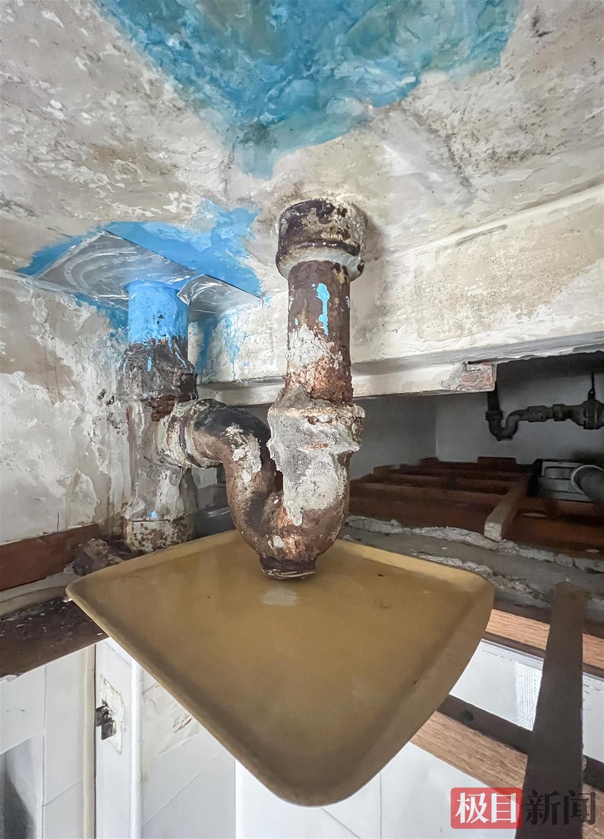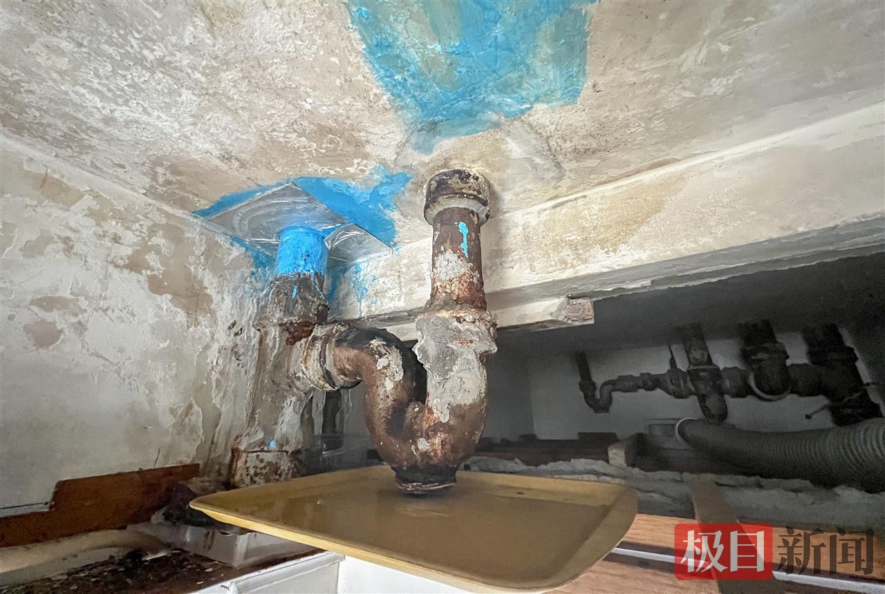 11月10日上午,新闻记者来到郭女士家看到,她家厨房右上角天花板排水管经过的区域周边,不仅有水渍印迹,而且不时有水滴下,下方扣板支架上用于接水的塑料托盘几乎接满了水。