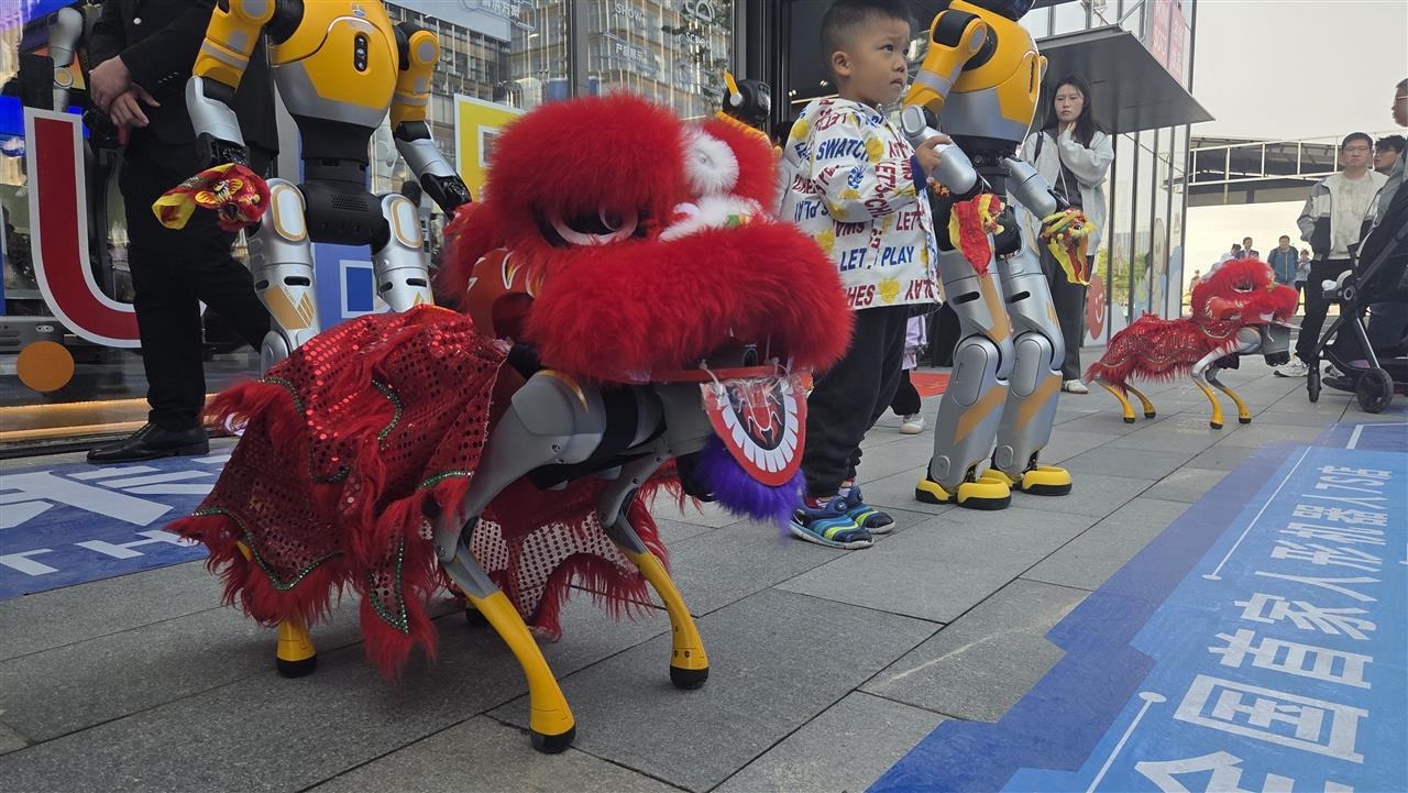 当日上午,店内气氛渐入高潮,参观者摩肩接踵,一场别开生面的机器人表演也拉开序幕。一排人形机器人击鼓迎宾,鼓点铿锵有力,动作整齐划一,引得观众连连惊叹。紧随其后的舞蹈表演中,机器人灵活转身、摆臂、跳跃,流畅的舞步丝毫不输人类舞者。机器狗也与传统舞狮相结合,实现机械与民俗的碰撞。表演结束后,观众们纷纷涌向展示区,与机器人亲密互动。一位带着孩子的家长感叹:“高科技的人形机器人就在商场里售卖,未来真的触手可及。”