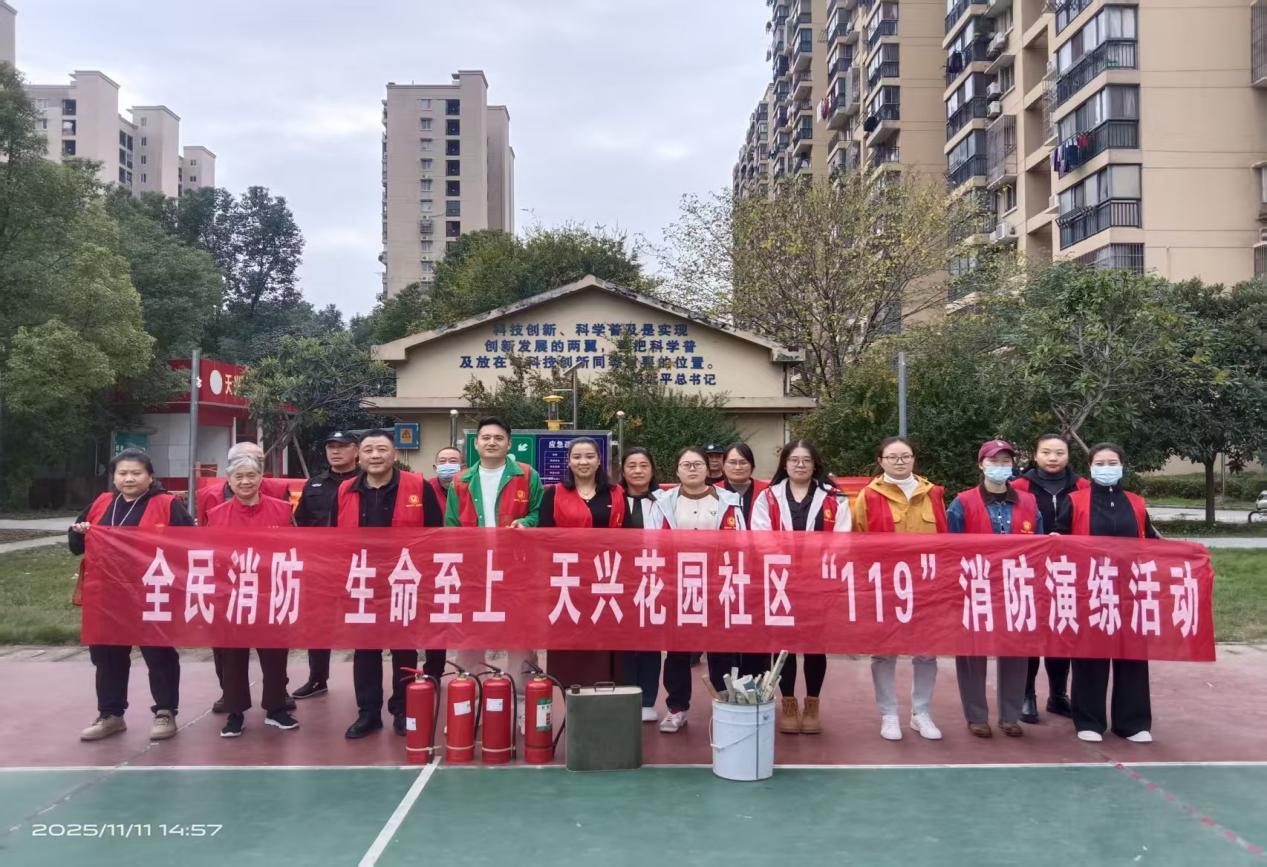 11月11日,武汉长江新区天兴花园社区开展“119消防宣传月”实战化消防演练活动,社区居民、物业工作人员及志愿者共70余人参与。