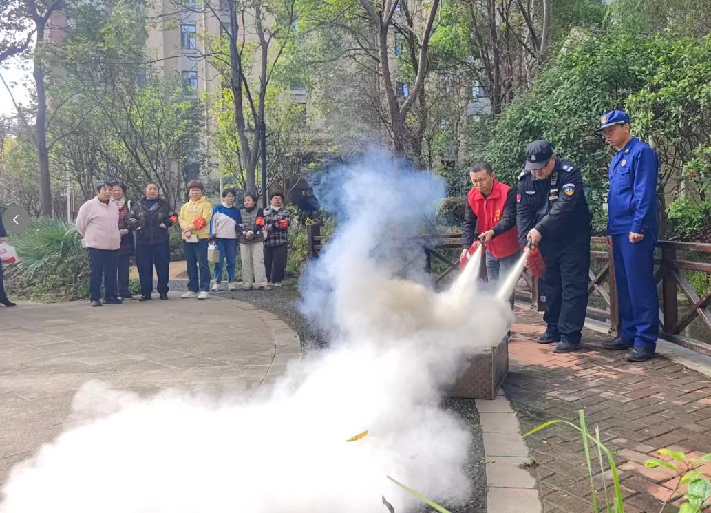 接着陈队长带领大家至小区东门主会场,针对灭火器这一最常见的消防器材,重点演示了干粉灭火器的正确使用方法,详细讲解“提、拔、握、压”四步操作流程。