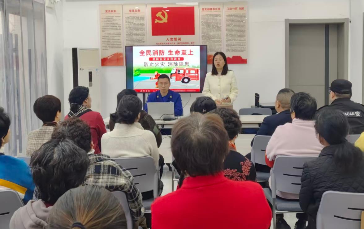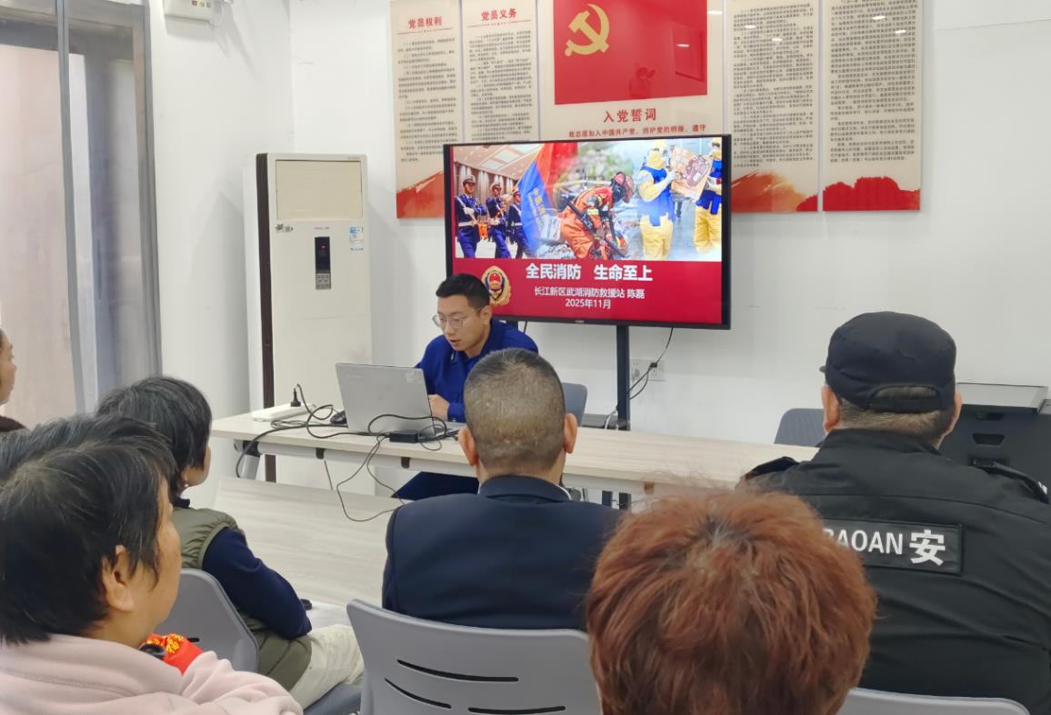 随后,武汉长江新区消防救援大队分队长陈磊结合小区火灾特点,系统讲解了火灾成因、预防措施、初期扑救、火场逃生自救等知识,通过典型火情案例视频,直观展现了烟头、违规充电等微小隐患可能引发的严重后果。
