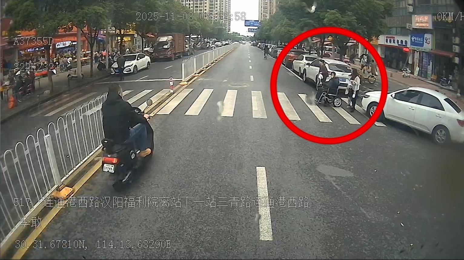 11月8日上午9时52分,汉阳区连通港西路靠近汉阳福利院的斑马线前,公交517路司机李敢驾驶232号车缓缓驶来。他突然瞥见了一位等候过马路的轮椅老人,没有丝毫迟疑,早早放慢车速,稳稳停在斑马线外。他伸出右手成立掌姿势,左右挥动示意老人优先通行。