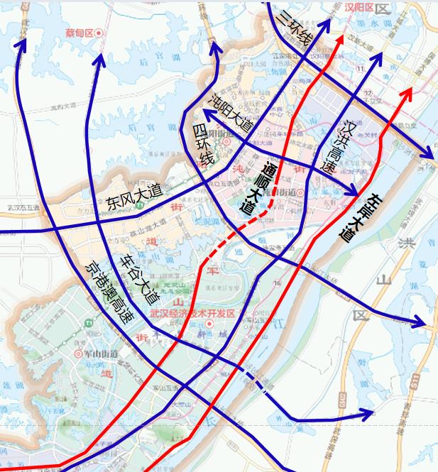 通顺大道是武汉经开区继东风大道、江城大道、左岸大道(沿江大道)之后连接主城区的第四条交通动脉,也是大汉阳片区交通一体化的重要组成部分。