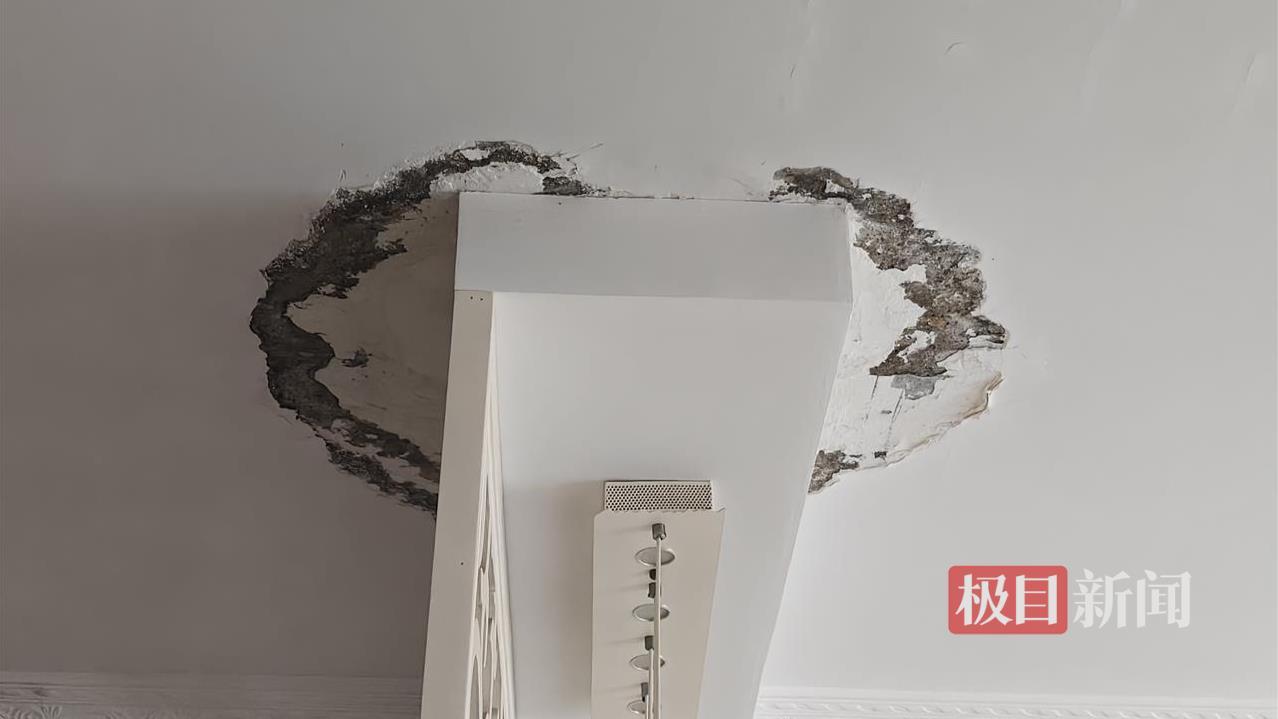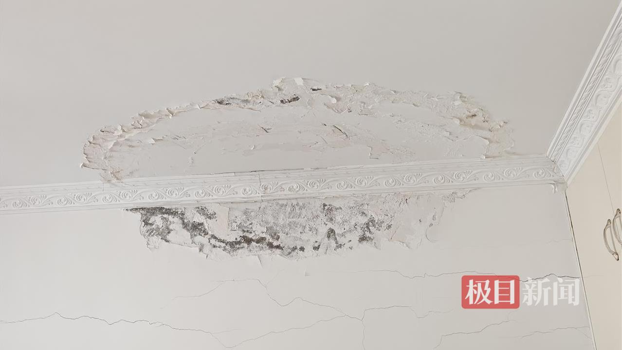 11月11日,记者来到余女士家中看到,客厅、卧室等多个房间的房顶均有明显水渍,部分墙面涂层因长期受潮已经起皮、脱落,露出里面的水泥层,形成不规则的深色印记。