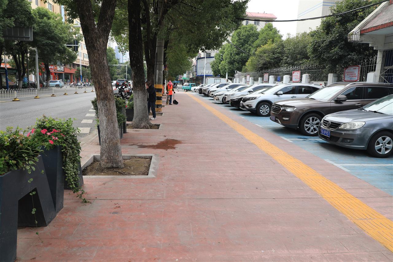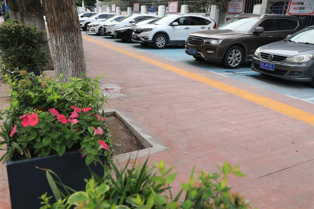 11月12日,在新洲区实验中学门口,新闻记者看到,红蓝两色步行道将停车区与人行道区分开来,中间的一条黄色盲道格外醒目(见下图)。人行道上设置了停车位,但没有破损和凹陷等现象。