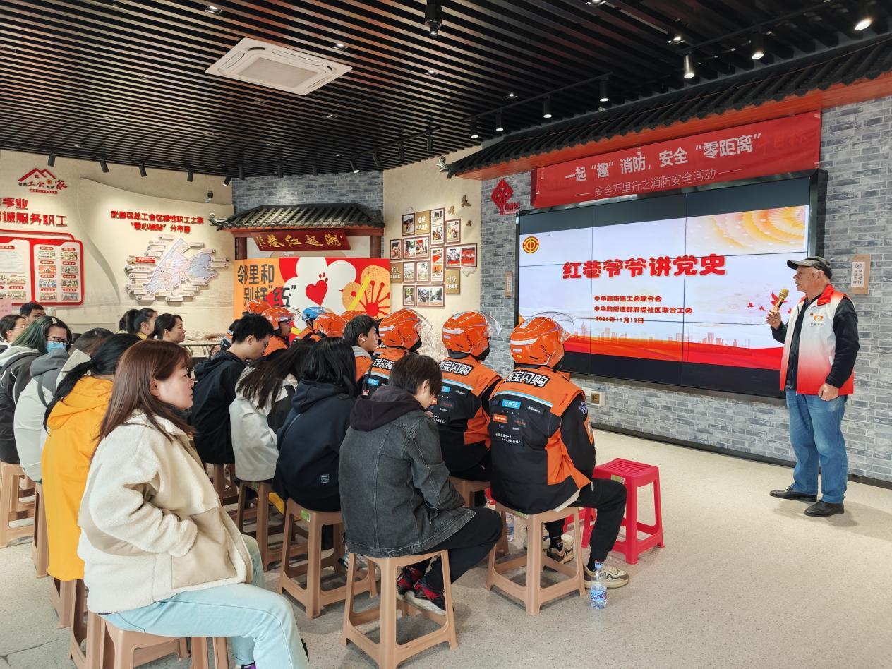 11月12日,武昌区中华路街道工会、街道平安办联合都府堤社区工会组织开展专题活动,邀请粮道街消防站、“红巷爷爷”邓广东分别带来消防安全知识讲座与党史故事分享,为新就业形态劳动者群体送上“安全护航+红色铸魂”双份成长礼。