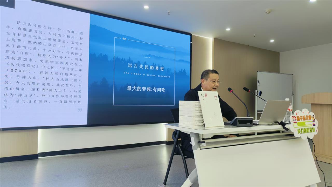读书会现场,杨中标会用武汉方言开讲,从《历代宅京记》里“神人骑白鹿出神山”的记载讲起,再聊起自己记忆里的稻田劳作、谷米河传说,瞬间拉近距离。