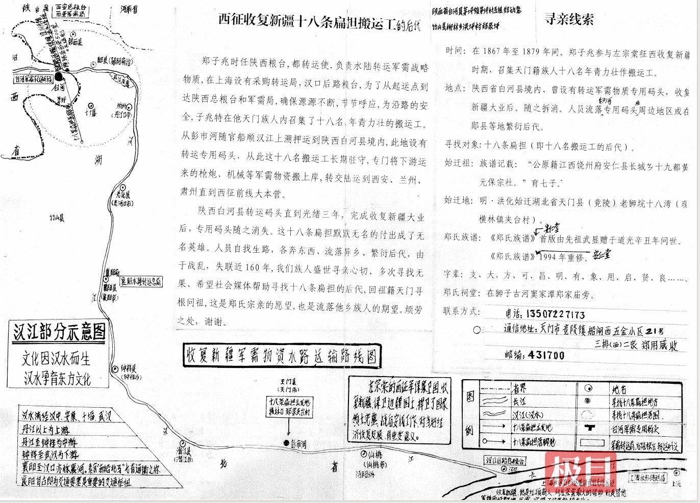 战争结束后,“十八条扁担”选择在陕西及周边安家落户。近些年,郑子兆的曾孙、今年90岁的郑用威接过自己爷爷和父亲的接力棒,继续寻找郑氏族人,并致电新闻热线(027-86777777)求助。
