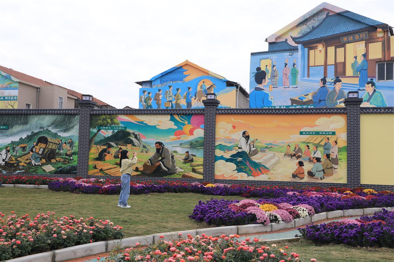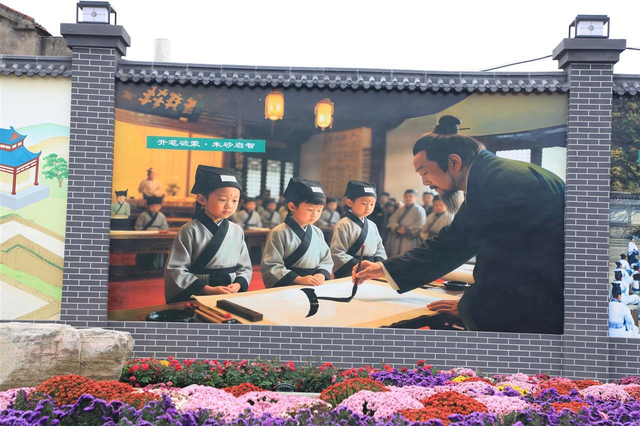 新闻记者现场看到,墙体采用油画与墙绘手法,再现了问津书院昔年风貌,“子路问津”“两小儿辩日”“不耻下问”等孔子传道经典场景(见下图)跃然墙上,与路边盛开的三角梅、月季、桂花等花卉交相辉映,营造出浓郁的书香氛围与自然意趣。
