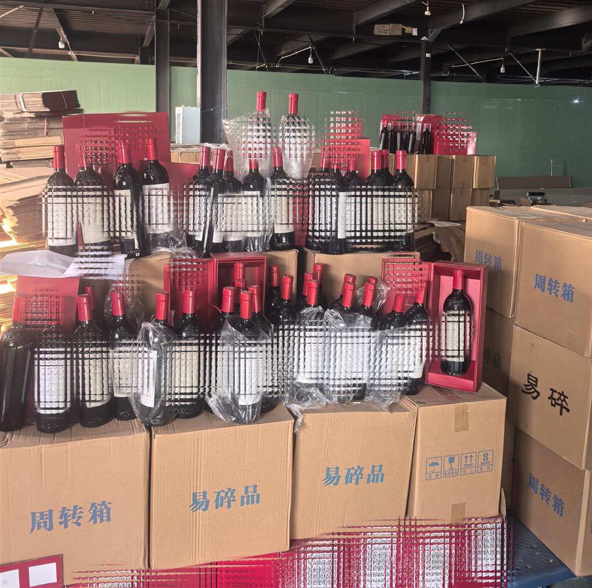 经清点,现场共查获假冒红酒成品及半成品4313瓶,包装盒、酒瓶等大量包装材料以及灌装机、贴标机等成套生产设备。