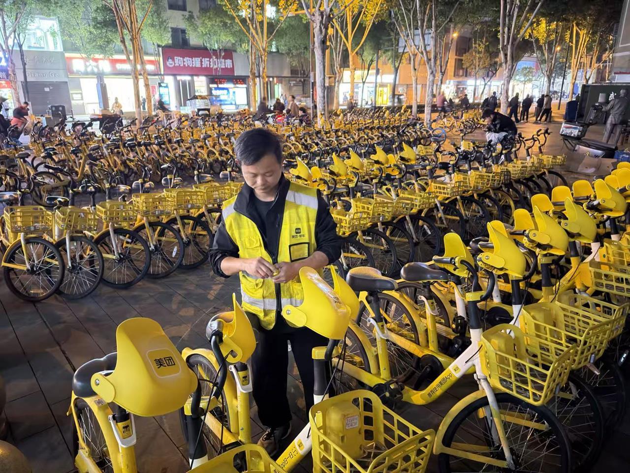 新闻记者在汉口三阳路与六渡桥地铁站、武昌友谊大道共享单车停车站点看到,运维人员正在给美团单车的左右车把上安装黄色的装置,它正好可以遮挡骑行者的双手,而不影响正常骑行。