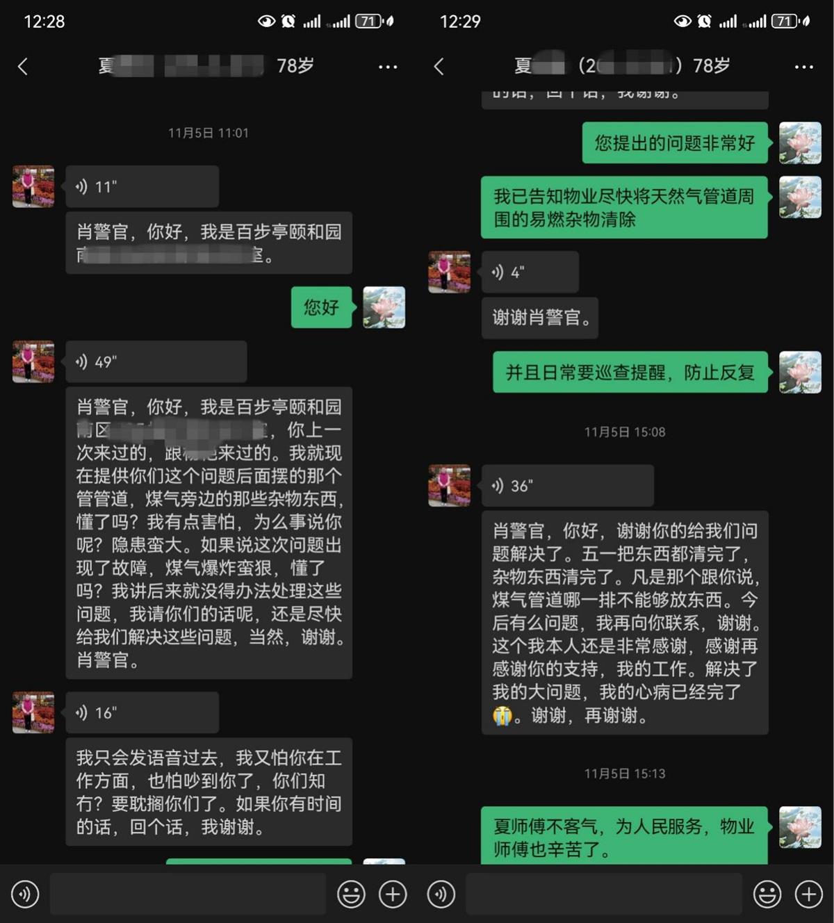 11月5日,肖子涵收到小区居民夏奶奶发来的微信,反映邻居在天然气管道旁堆放了大量易燃杂物。她立即警觉起来——“消防安全无小事”,这个念头在她脑海中闪过。没有丝毫耽搁,她第一时间联系物业房管员,约定共同上门查看。
