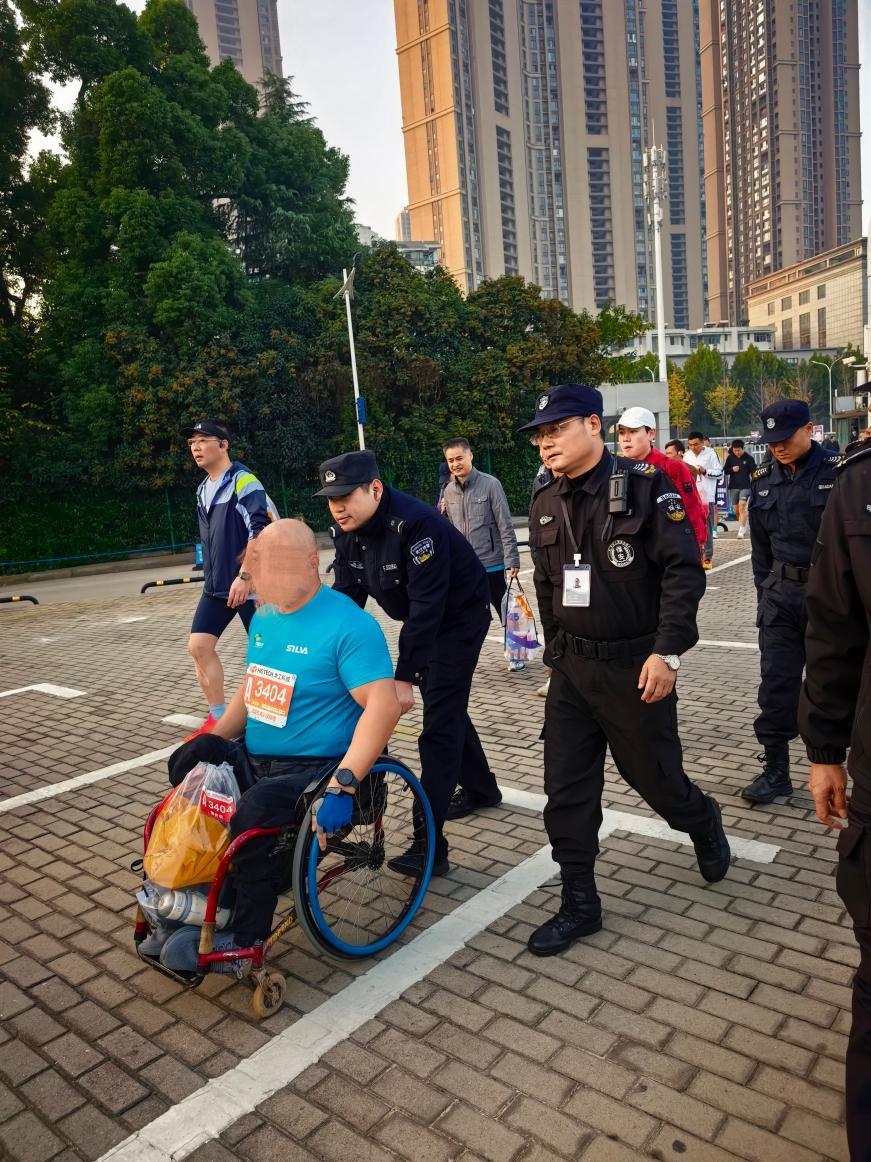 清晨7时许,一名残障跑者在到达安检点时,因轮椅卡住,难以前进。关东派出所辅警万成看到后,立马上前协助这位选手把轮椅推到了安检点,并送上真诚祝福。微小却及时的帮助,让这位特殊的参赛者感受到了光谷的温暖。