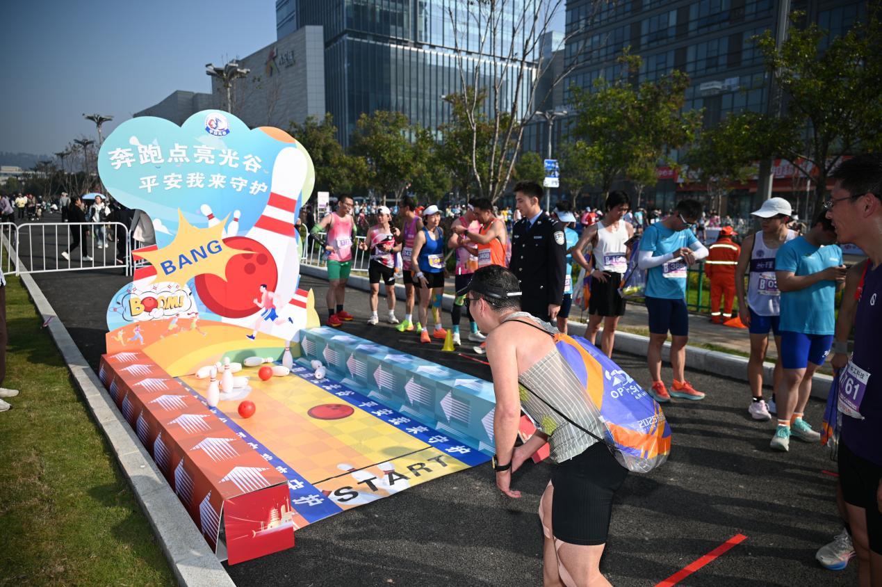 今年东湖高新公安的一项创新之举,是在半程马拉松终点区域推出“反诈+马拉松”特色宣传活动。完赛选手可参与趣味保龄球互动游戏,击倒八个瓶子后即可抽取反诈主题盲盒。
