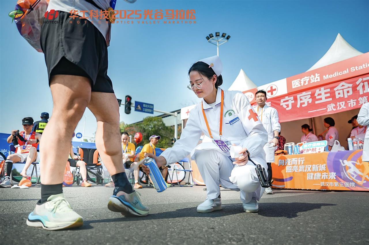在全马和半马冲线处,每当有跑者抵达终点,来自武汉大学中南医院、武汉市第三人民医院、光谷各社区卫生服务中心等医疗机构的医务工作者便立即迎上前,为有需要的跑者提供服务。