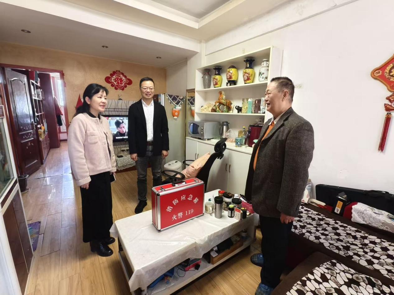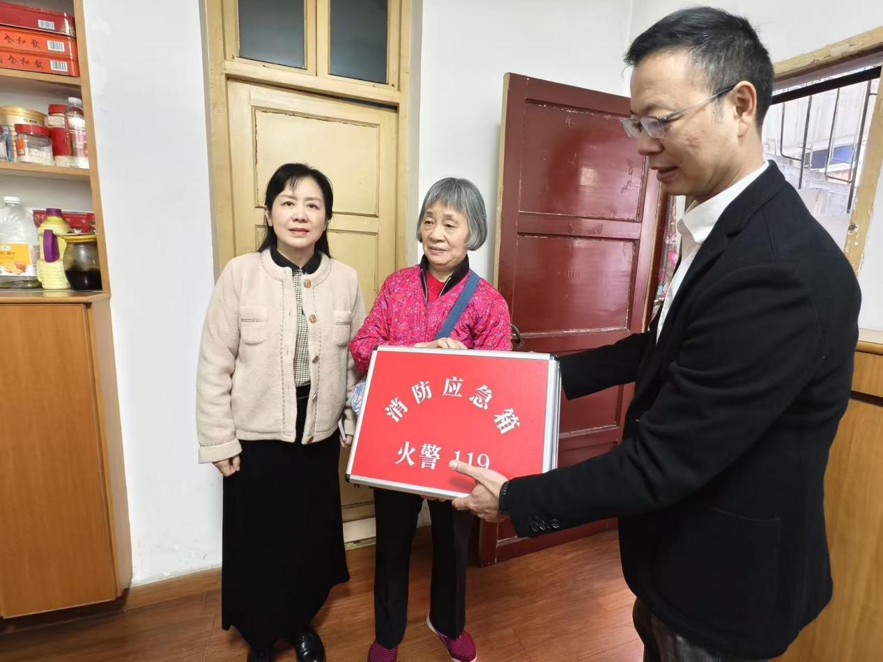 活动现场,市审计局党员干部全程沉浸式参与——在向群众宣传消防安全知识要点的同时,还组织群众演练灭火器操作、消防水带铺设等实战技能。更暖心的是,他们还为辖区困难家庭、独居老人送上“安全大礼包”:内含灭火器、灭火毯、防毒面罩、逃生绳、强光手电筒的消防安全应急包,搭配全新安全插线板,手把手帮居民更换老旧设备,从源头掐灭家庭火灾隐患。这份“消防宣传演练+特殊群体关爱”的双重暖意,收获社区居民连连点赞。
