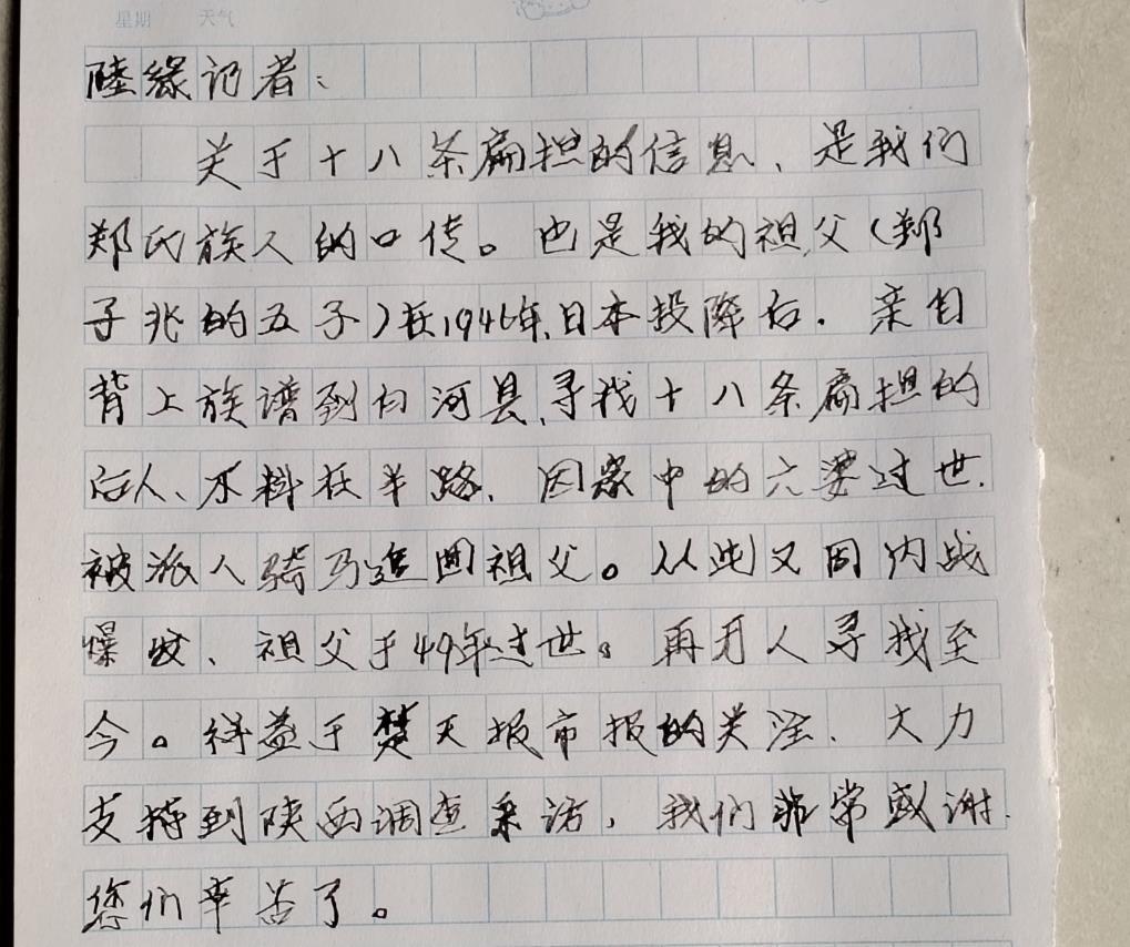 “关于十八条扁担的信息,是我们(当地)郑氏族人的口传。”在信中,郑用威告诉记者,抗战胜利后,1946年,他的祖父(郑子兆的五子)背上族谱到陕西白河县寻找“十八条扁担”的后人。不料在半路,因家中的六婆过世,被派人骑马追回祖父。此后因解放战争爆发搁浅,其祖父又于1949年过世,再无人寻找至今。