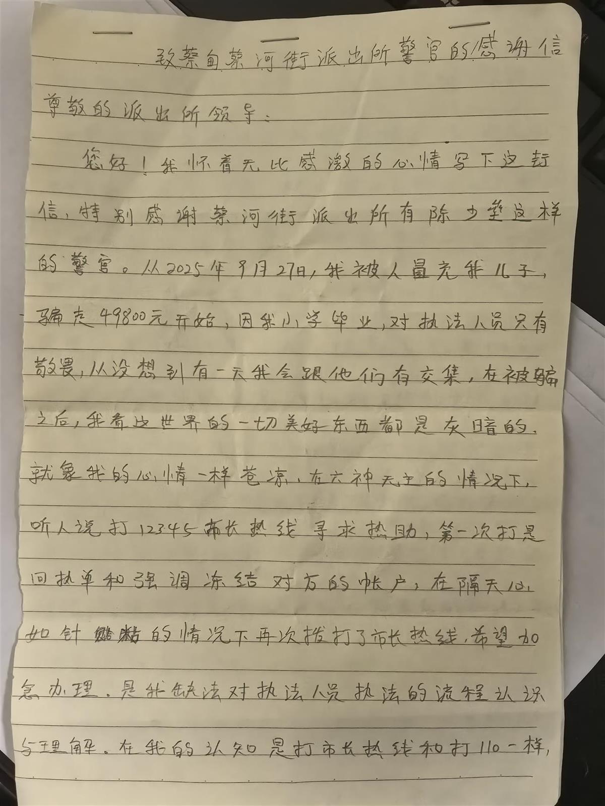 “在我多次误解的情况下,陈警官还在尽力为我挽回损失……他亲切的话语,润进我的心里。那份对工作的投入和执着,以及全心全意为民办事的心,让我衷心感谢。在此,向所有人民警察致敬。”王女士在致派出所领导的感谢信中写道。