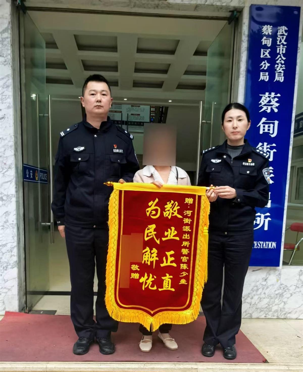 11月6日上午,武汉市公安局蔡甸区分局蔡甸街派出所的群众接待室内,市民王女士从民警陈少垒手中接过一沓厚厚的现金。她仔细清点,正是自己之前被骗走的49800元。“谢谢你们……”她激动得有些哽咽,将一面印着“敬业正直 为民解忧”的锦旗送给民警。
