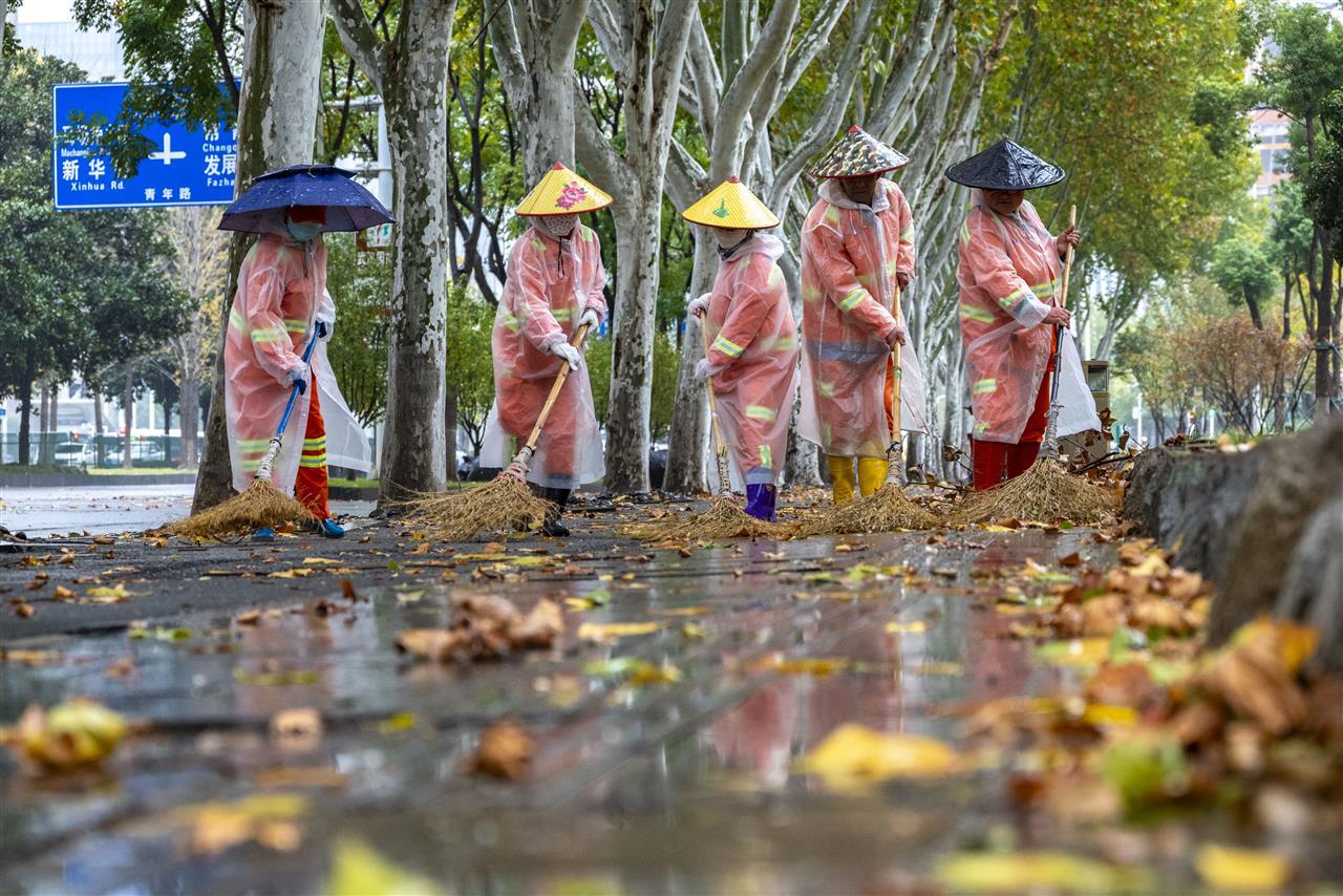 由于雨天路面湿滑,落叶易附着地面,清理难度加大。江汉区环卫部门及时调整作业方式,在落叶较多路段采取“人工+机械”协同清扫,利用机扫车高效作业,并设置临时落叶堆放点,配合清运车辆巡回收集,大幅提升转运效率。据统计,当天全区共出动环卫工人530余名,清运落叶等垃圾135吨。