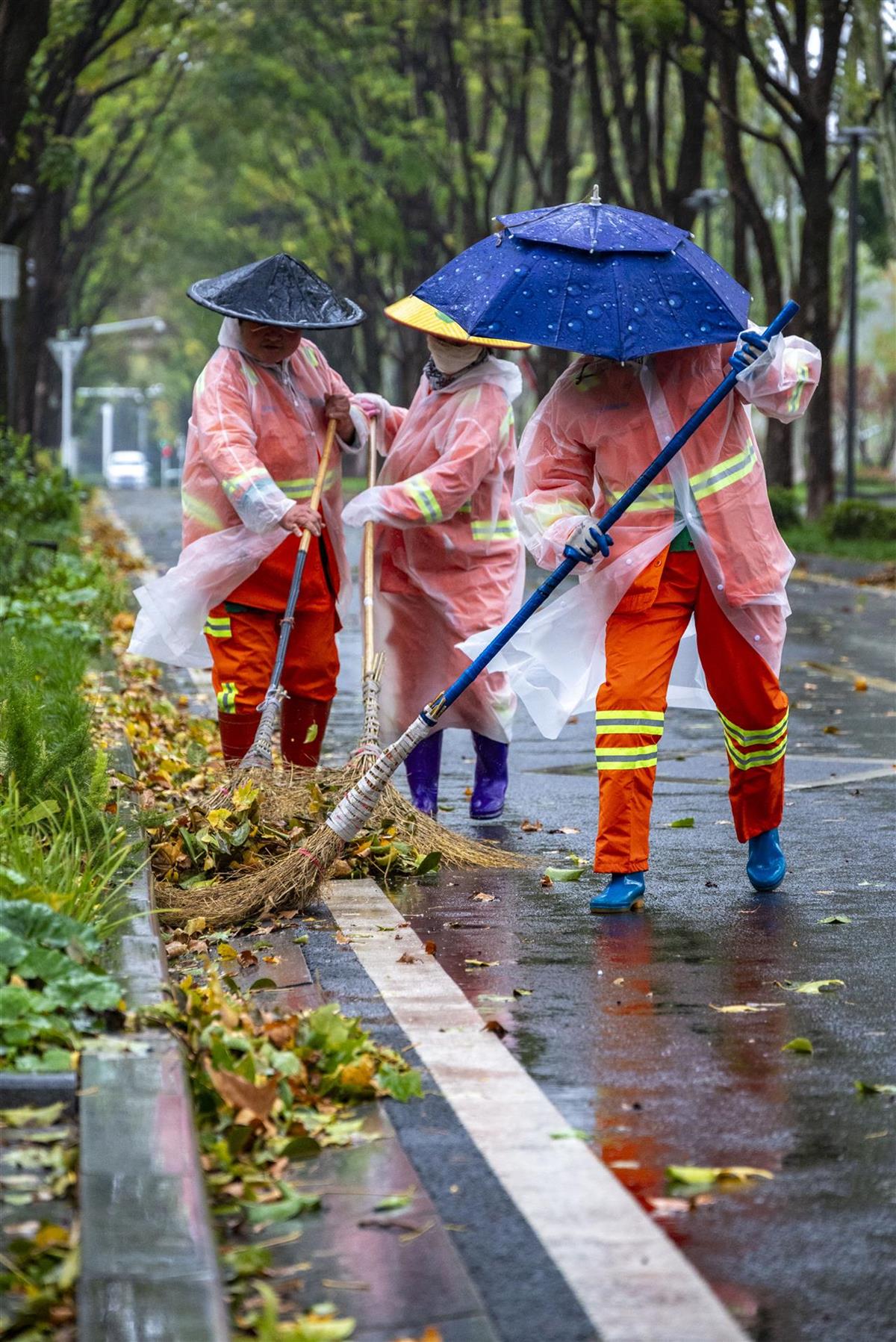环卫工人不停清扫落叶
