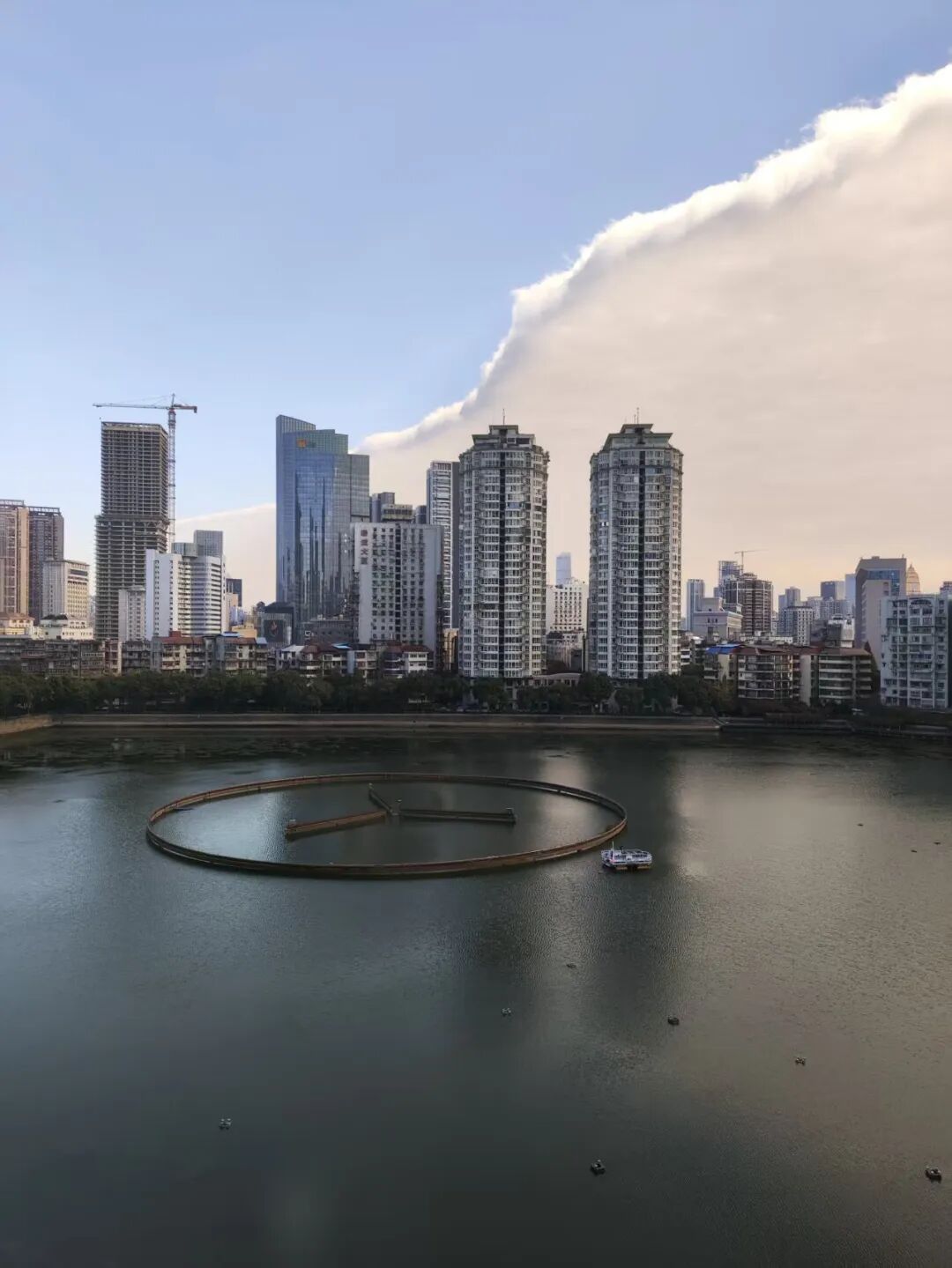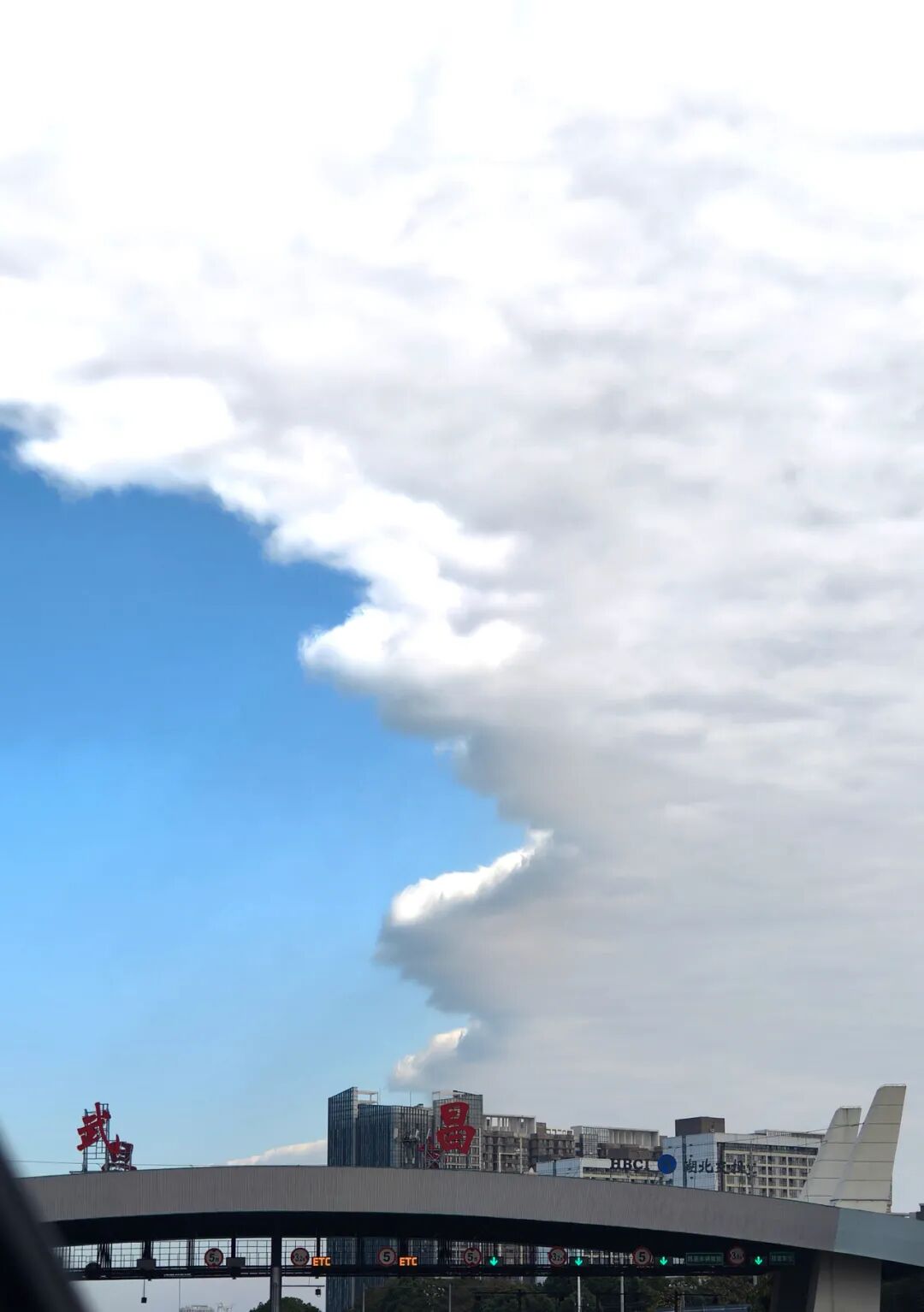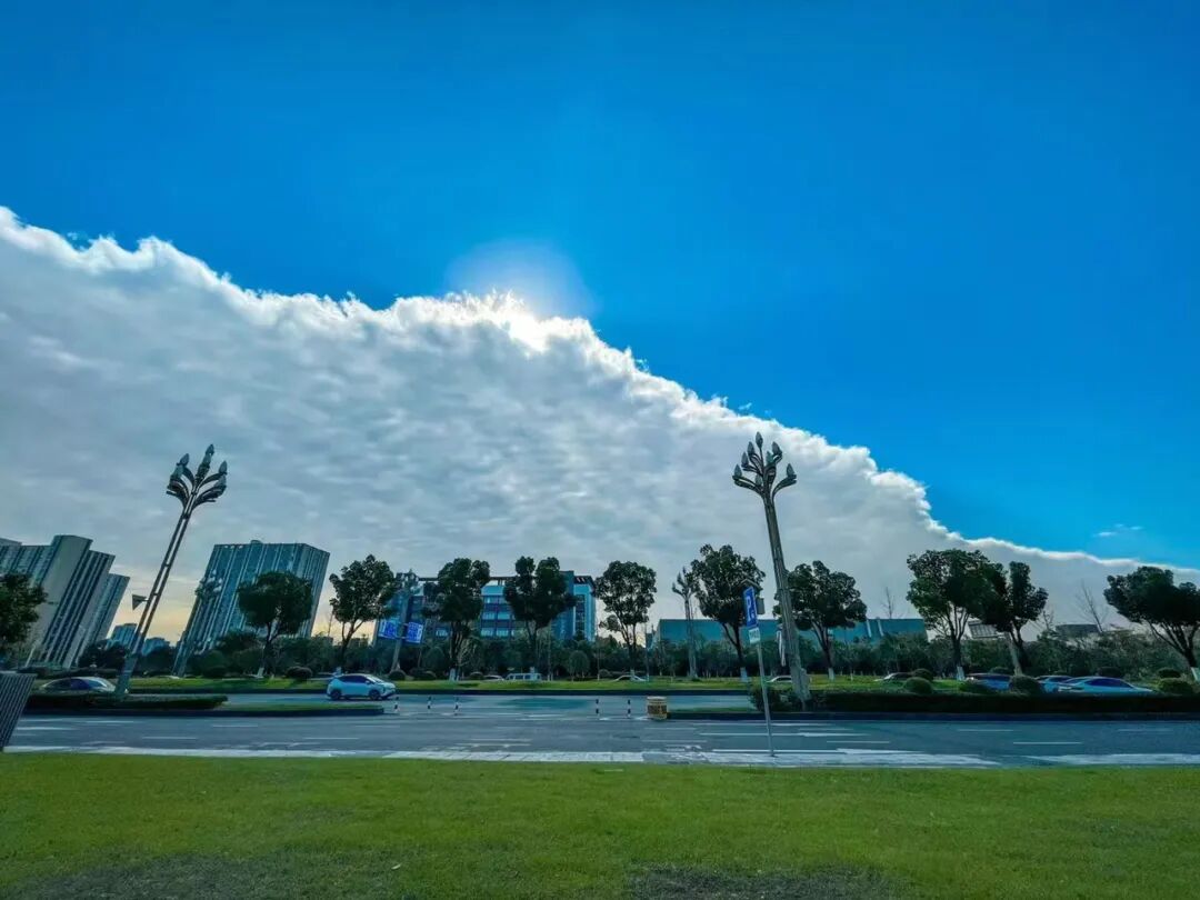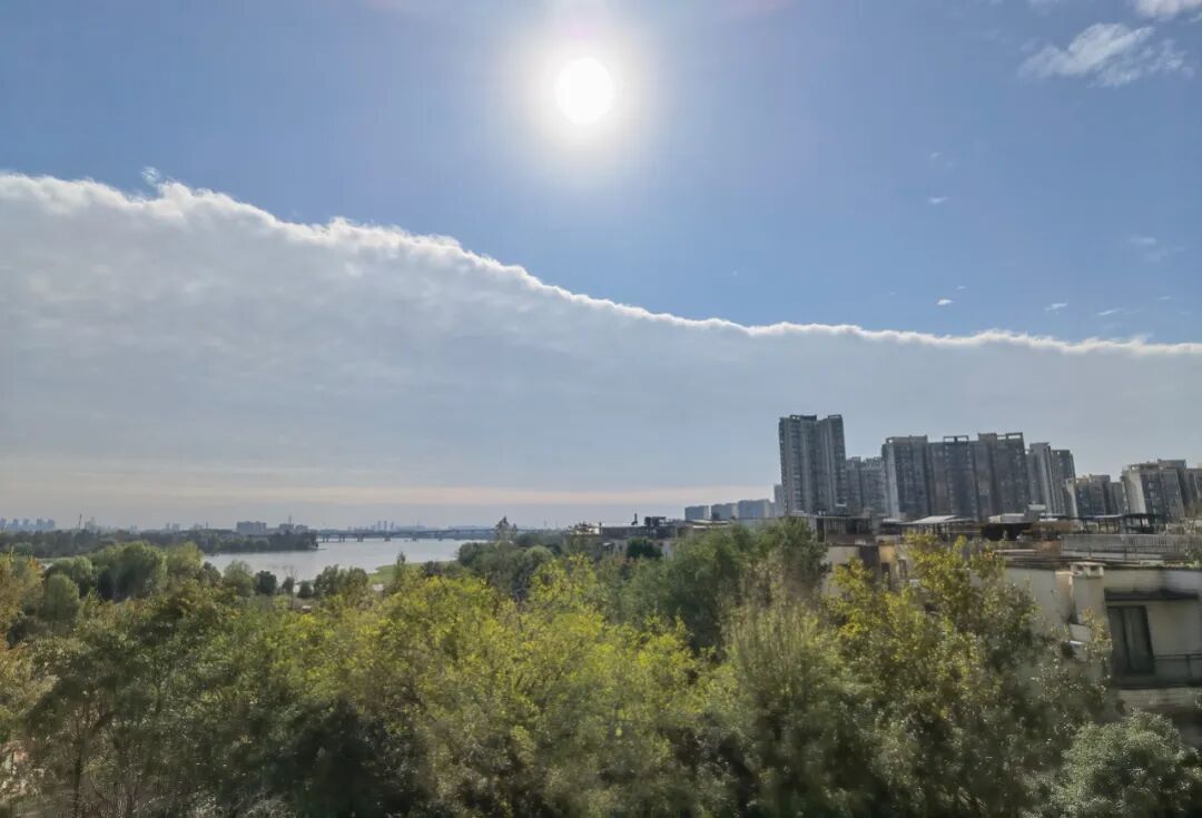 其实,这种泾渭分明的云层分界线出现时,往往意味着有干冷天气系统在移动,和暖湿云层相互挤压,挤压力就会导致蓝天白云出现了整齐的界限,从而看起来泾渭分明。简单来说,就是冷暖空气在“掰腕子”,预示着天气可能会有变化。