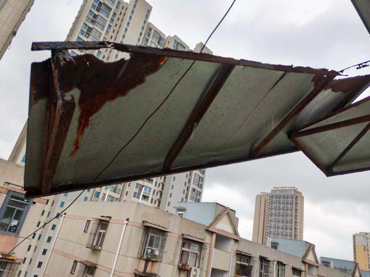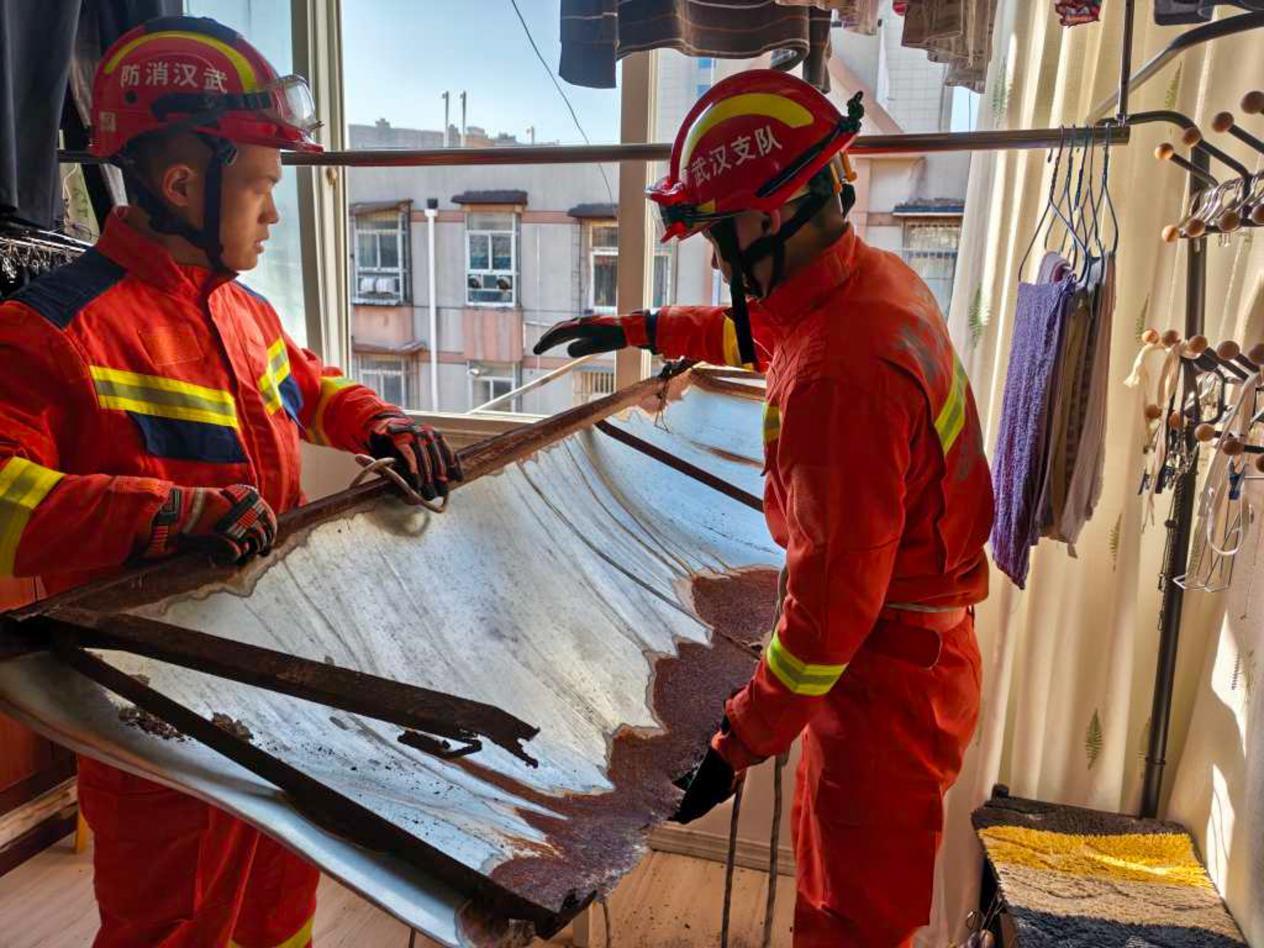 同日11时49分,武汉市武昌区平安花园小区一铁质遮阳棚发生脱落险情。中山路消防救援站立即派员赶赴现场处置。消防员抵达后发现,该遮阳棚长2.5米、宽0.6米,卡在7楼阳台外侧,下方为小区人行通道及停车位,一旦坠落极易砸伤行人或损毁车辆。据报警住户介绍,家中突然听到异响,经查发现遮阳棚受强风影响出现断裂即将脱落,随即报警求助。救援人员迅速开展处置:先在现场下方设置警戒区域并安排专人值守,严防坠落风险;其余队员携带剪扩钳、安全绳索、破拆工具等装备,先以绳索固定遮阳棚防止晃动,再通过剪扩钳精准剪切,最终将遮阳棚安全卸下。