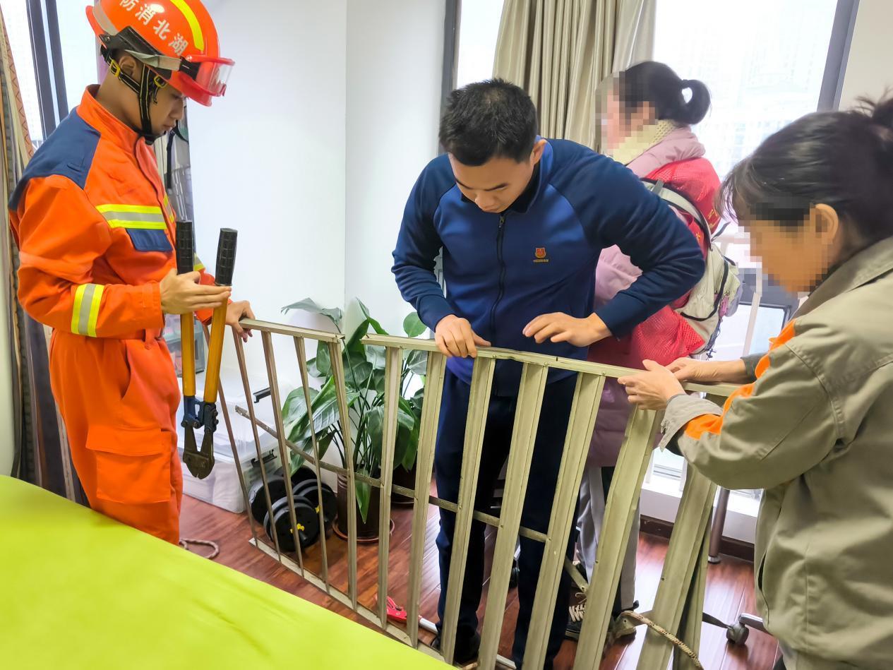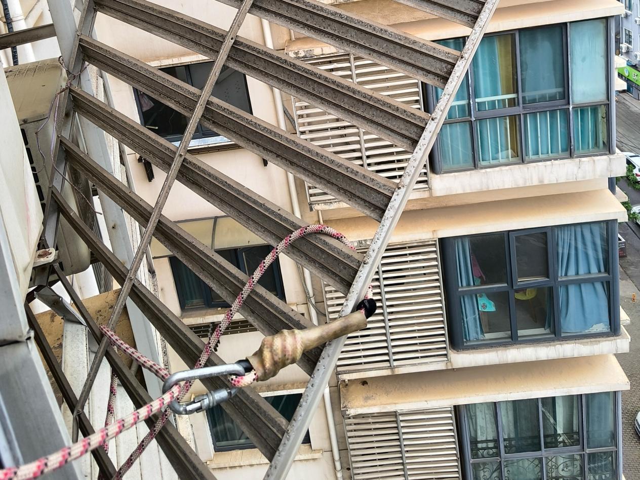 消防员第一时间在楼下设置警戒带并安排专人值守,防范护栏意外坠落风险;其余队员携带剪扩钳、绳索、抓钩等工具展开处置,先用抓钩配合绳索固定护栏防止晃动,再通过剪扩钳精准操作,成功将松动护栏安全取下,及时解除高空安全隐患。