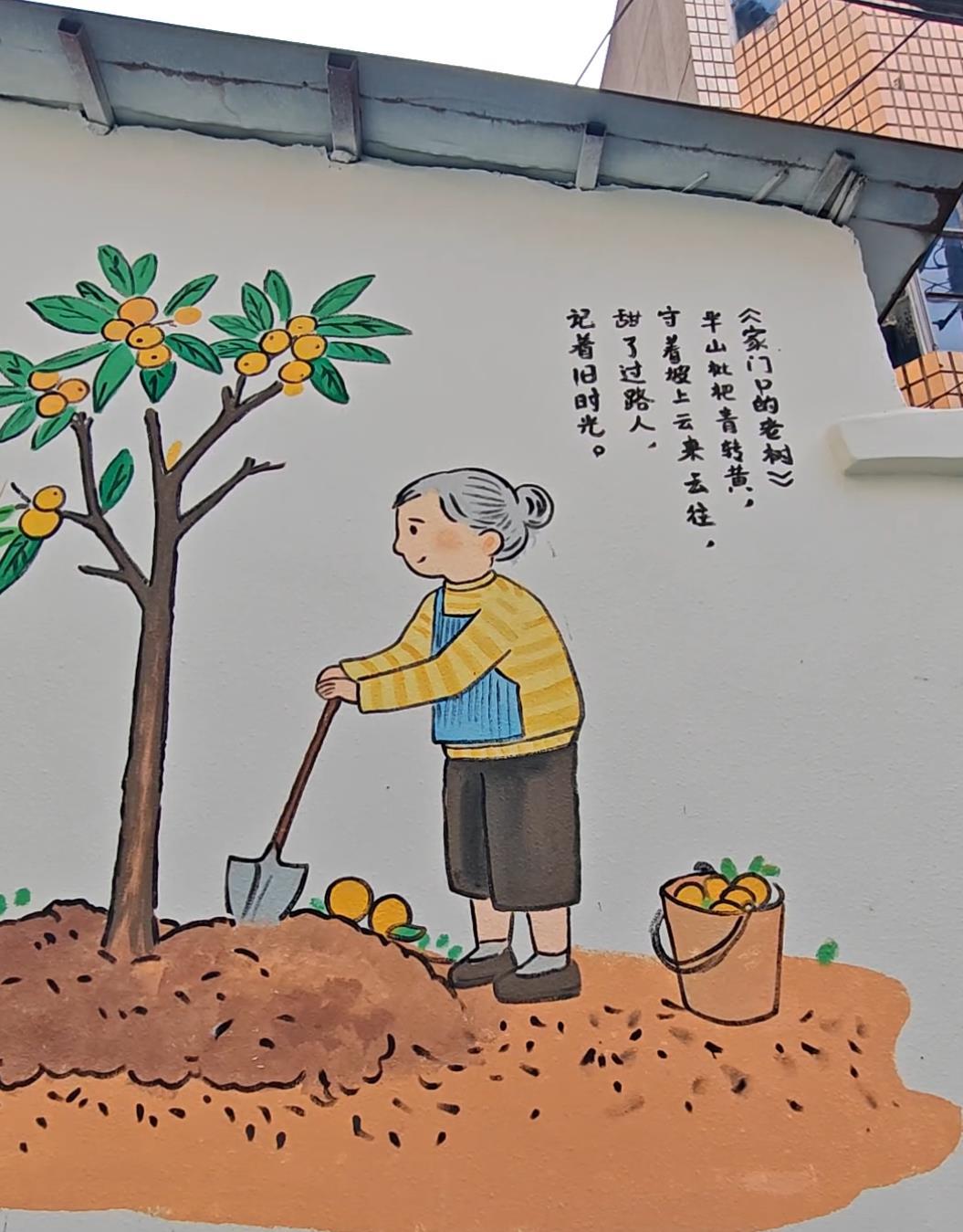 墙面上,不是冰冷的水泥肌理,而是一幅鲜活的涂鸦:头发花白的鲁婆婆手里握着小锄头松土施肥,枝头挂满橙红的柿子,仿佛能闻到清甜的果香。