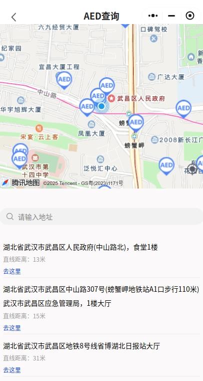 想快速找到身边的AED?打开微信小程序,搜索“武汉急救便民服务”,进入小程序主页面,找到“AED查询”,就能精准定位,您当前所在位置附近的AED点位。