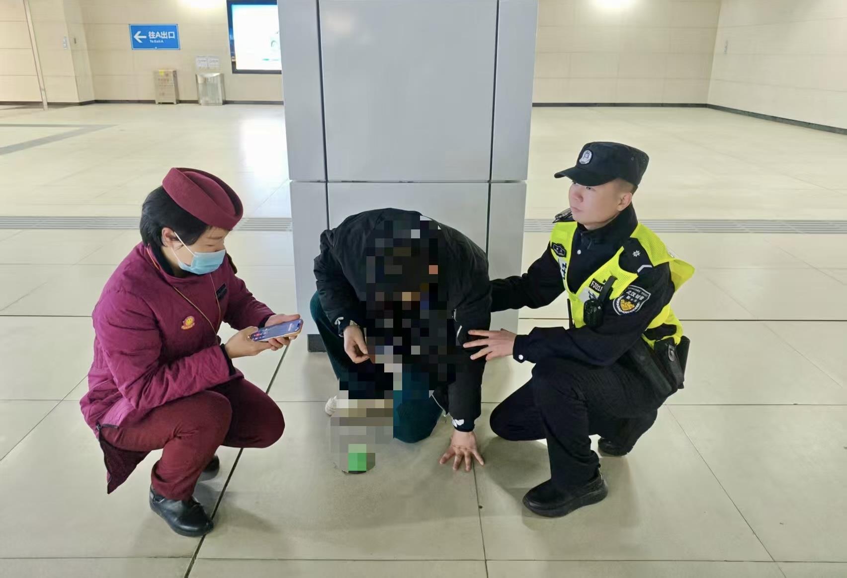 当天8时50分许,武汉市公安局轨道交通管理分局辅警丁啟建、朱永轩在地铁2号线范湖站巡逻时,发现一名男乘客半跪在A出口厕所门前通道处地面上,左手撑地,右手捂着腹部,眉头紧锁,表情痛苦。