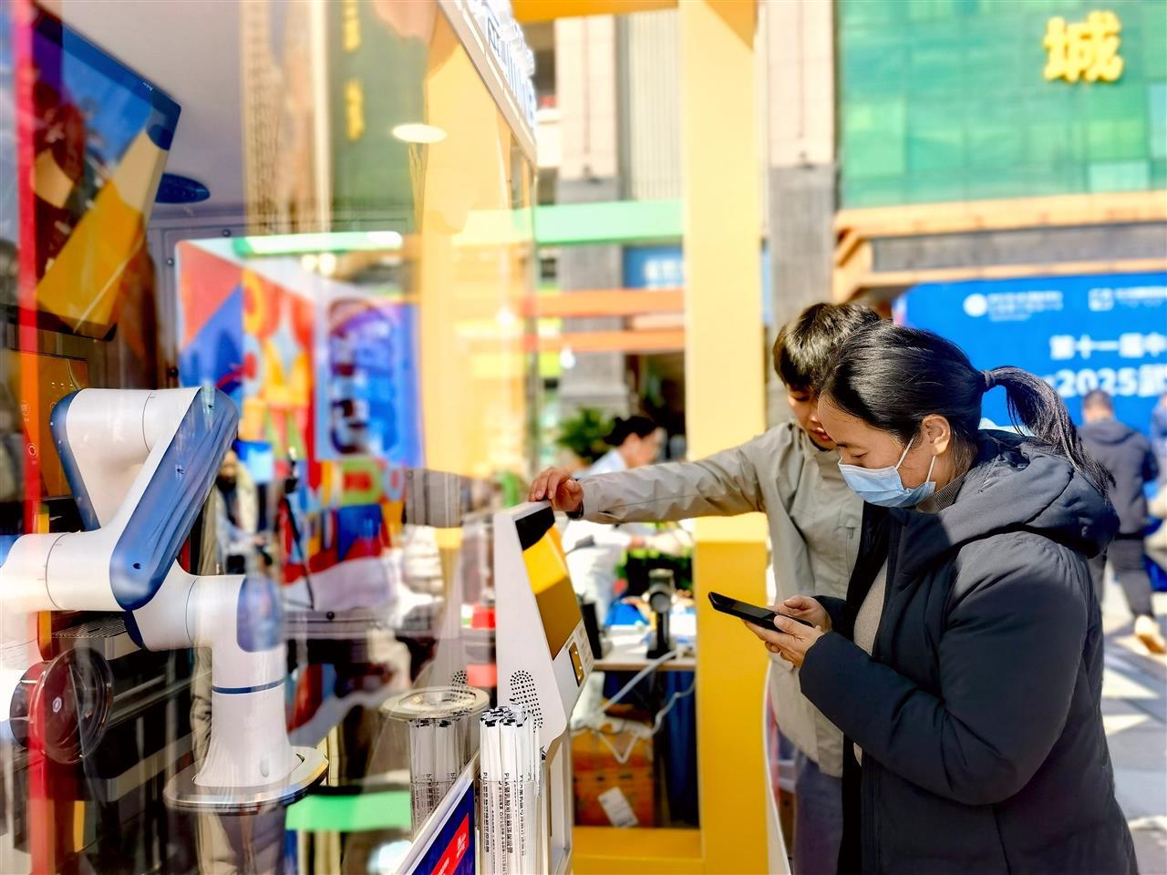 在展区核心位置,通体银白、大约有两米高的亭式咖啡机器人“灵犀”,正吸引市民游客或观看,或点单。消费者只需在触摸屏上选择饮品品类、扫码付款,玻璃罩内的机械臂便立刻启动:精准抓取咖啡豆研磨,冲入适量热水和白糖,再细腻地打发牛奶、注入杯中,整套流程行云流水。