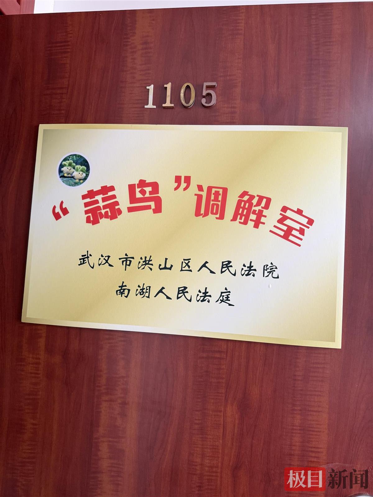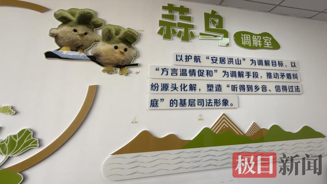 当一只绿色玩偶用武汉方言说出热梗“蒜鸟蒜鸟,都不yong易~”“蒜鸟蒜鸟”,你能想象这是在法院调解室里发生的场景吗?近日,有网友发帖称,武汉市洪山区人民法院南湖人民法庭(以下简称“南湖法庭”)出现了一间名为“蒜鸟”的调解室,迅速引发广泛关注。11月20日,新闻记者实地探访该法庭,一进门便看到了这间特色调解室——墙上绘有两只可爱的“蒜鸟”玩偶,氛围轻松亲切。