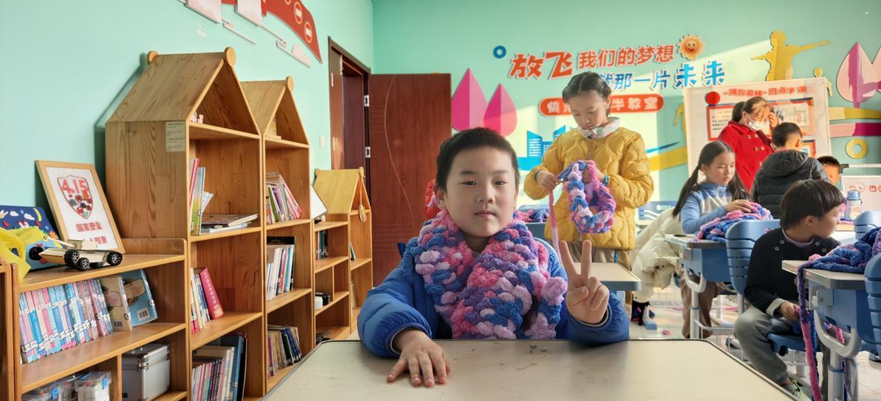 “织完一排啦!比你的快!”“我的围巾花纹编得匀称,最好看!”活动室里洋溢着欢声笑语。从生疏到熟练,从一团毛线到初具雏形的围巾,每个孩子脸上都写满了专注与自豪。一个多小时后,一条条充满童趣的围巾陆续完成,有的小朋友迫不及待地把半成品往脖子上比画,软糯的毛线贴着小脸,暖意直达心底。