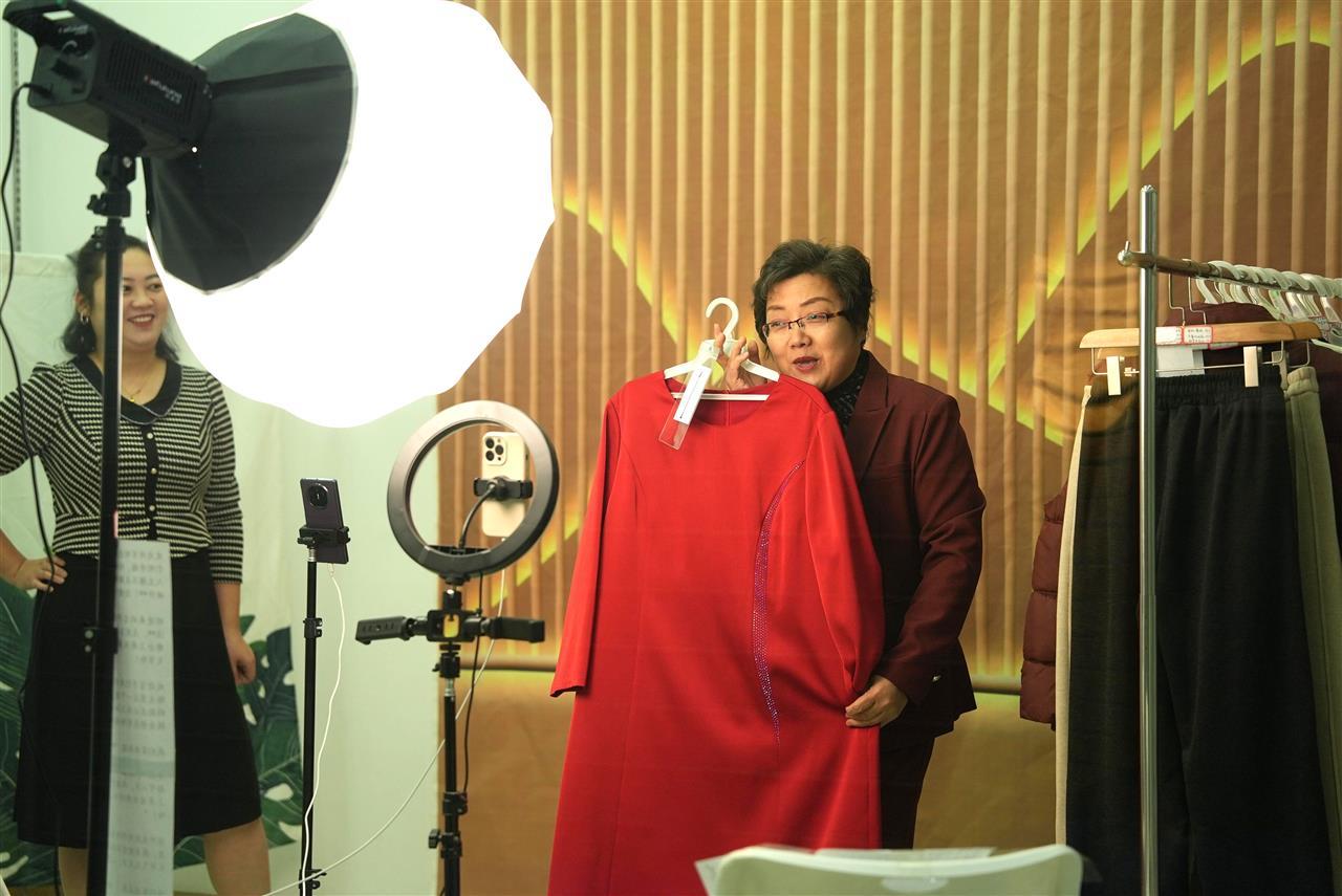 上午10点,随着首场直播信号开启,各个直播间迅速进入状态。9号直播间内,54岁的王军身着酒红色西装,利落的短发搭配自信的笑容,一开口便抓住了观众注意力:“悦人先悦己,这件红色连衣裙上身超级显气色,心动的宝宝赶紧留言关注!”作为一名退休人员,这是王军首次正式接触直播,而她参赛的初衷,是为了给退休生活增添更多色彩与挑战。