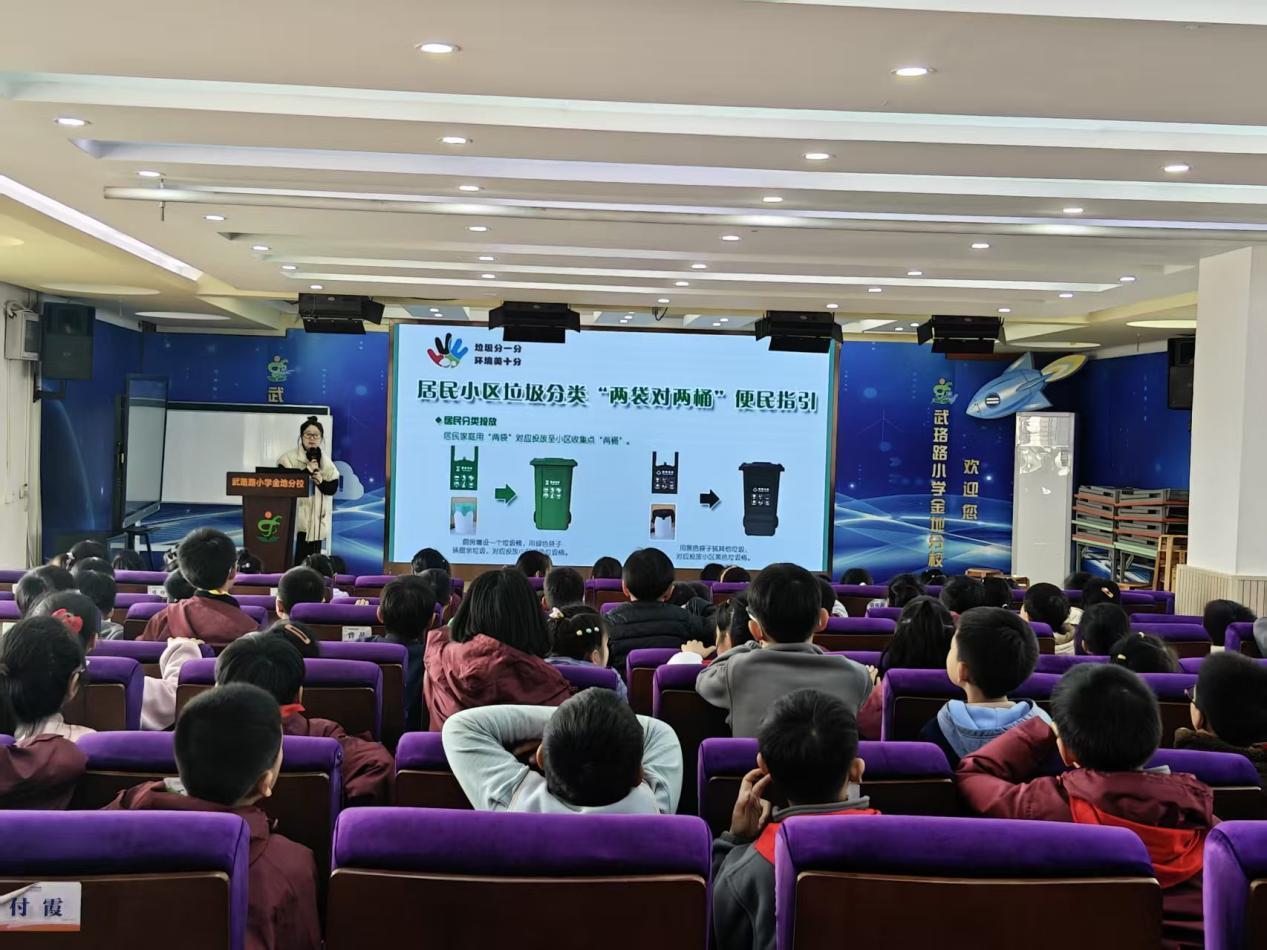 当天,洪山区生活垃圾分类“两袋对两桶”科普进校园系列活动正式启动(见下图)。活动以校园为起点,通过趣味科普与实践工具相结合的方式,将垃圾分类理念深植学生心中,搭建“家校联动”环保桥梁,凝聚共建绿色家园的合力。