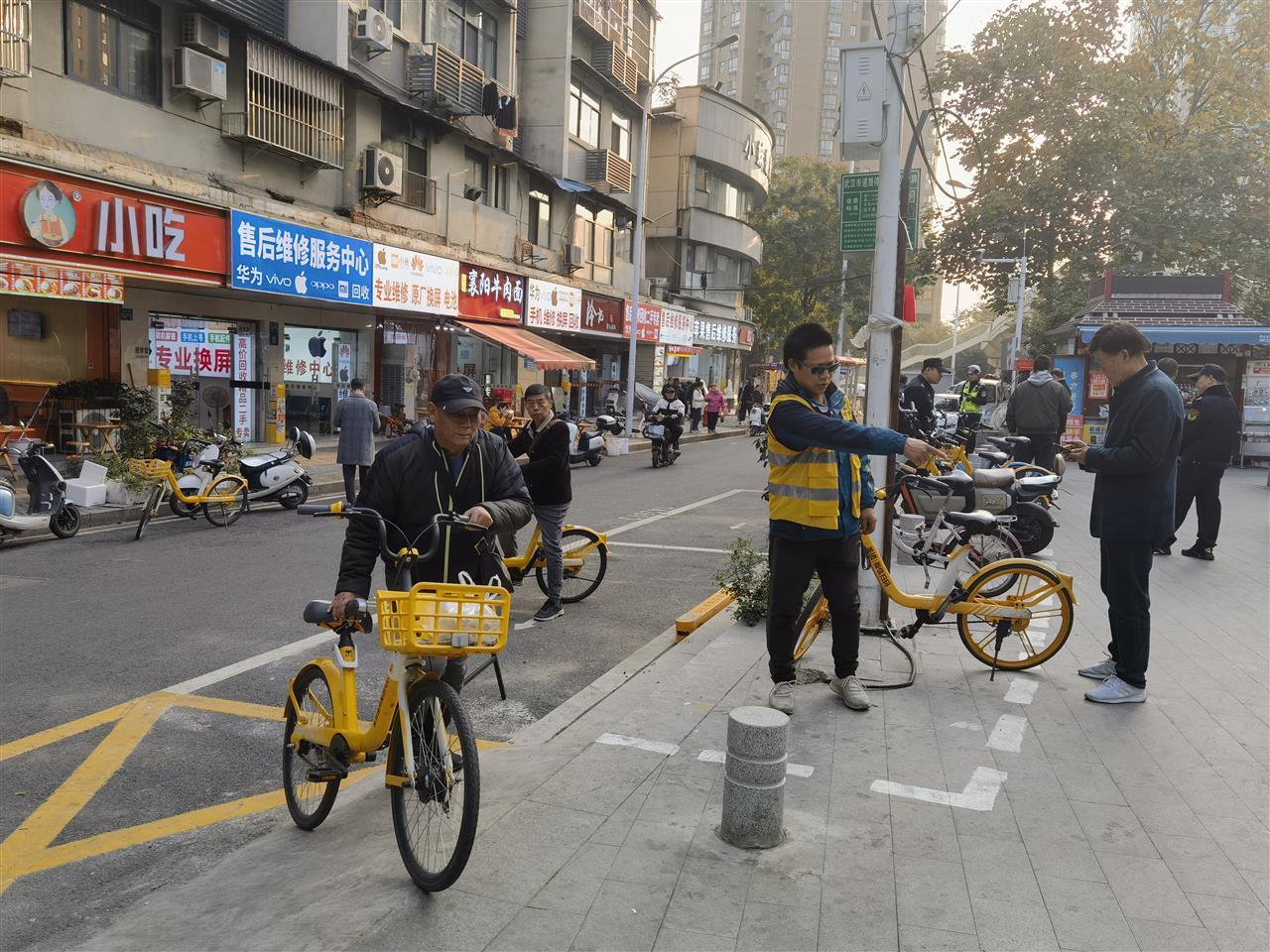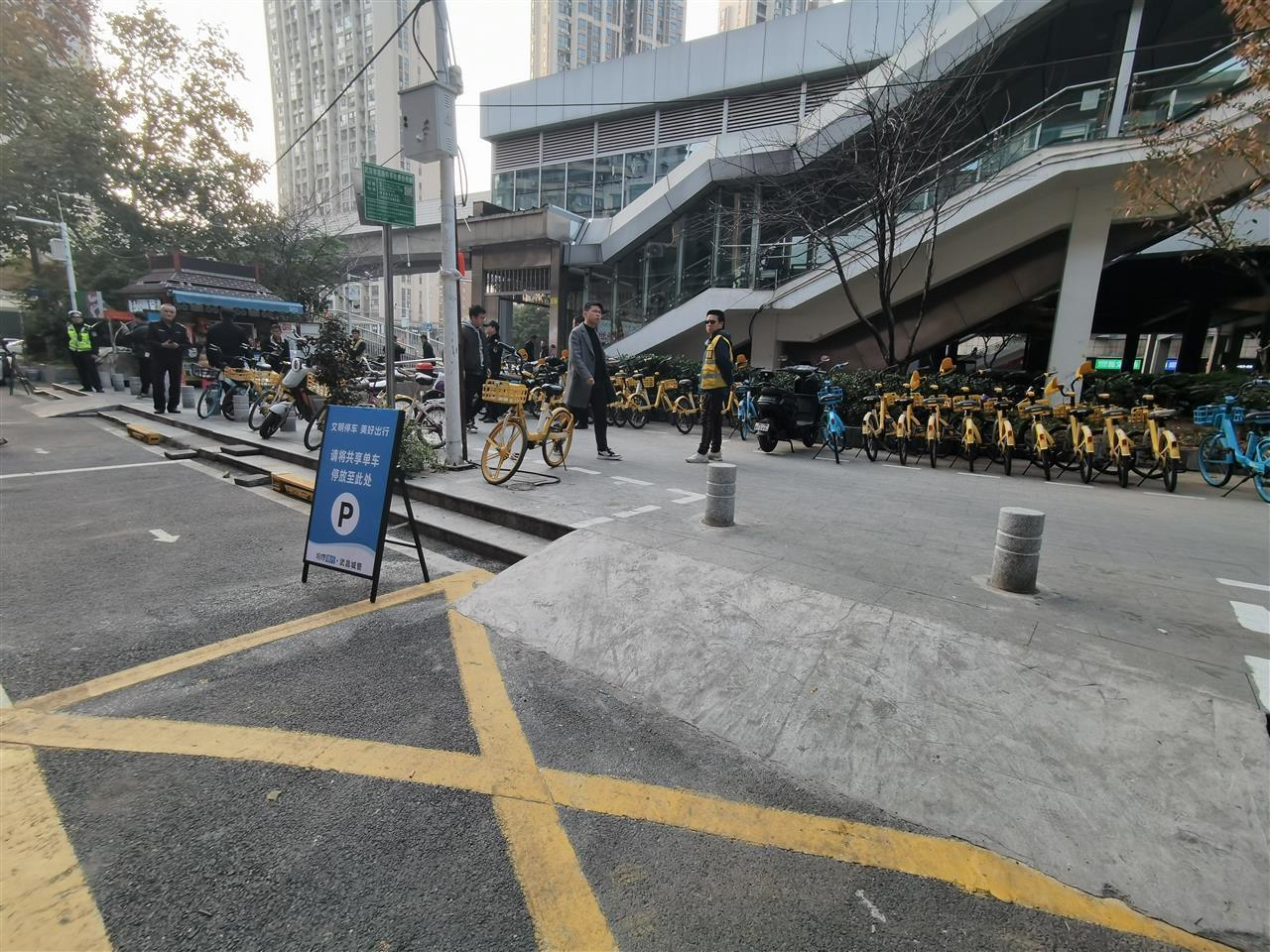 聚焦这一痛点,江岸区车站街道多次现场勘查找准问题症结,通过台阶处增设便民缓坡,消除高低差,实现“无障碍停放”,同时联合美团、哈啰等两家单车企业,运用电子围栏技术明确A、B口周边停车范围,并设置醒目标识。同时,结合单车潮汐规律,组织综合执法中心队员与社区志愿者在高峰时段现场引导市民规范停车,并推动企业按需调度、加快周转。