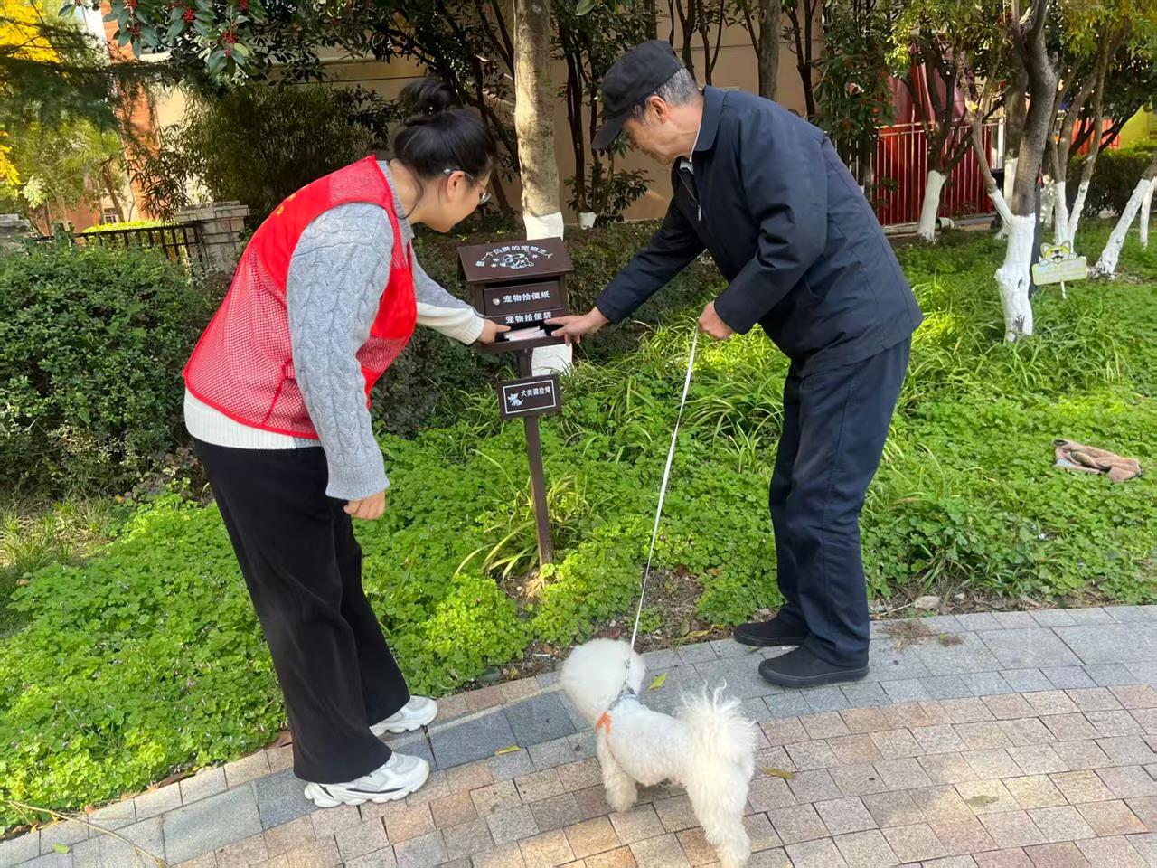 现场同步设立“三方议事微现场”,为居民提供反映养犬相关诉求的渠道,推动问题及时响应。在设施配套方面,小区在主要路段及宠物活动频繁区域增设了文明养犬提示牌,并配置便便箱,提供免费的拾便袋和拾便纸,方便居民随时取用,促进宠物粪便及时清理。