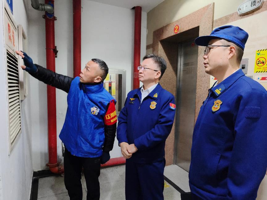 在江岸区,武汉市消防救援支队支队长胡庚松先后前往协昌里小区、大江苑南园,重点检查了楼道疏散通道、防火门关闭状态、消防控制室值班及电动自行车充电点管理情况,强调必须落实防火门“一开一关”要求,确保生命通道畅通。
