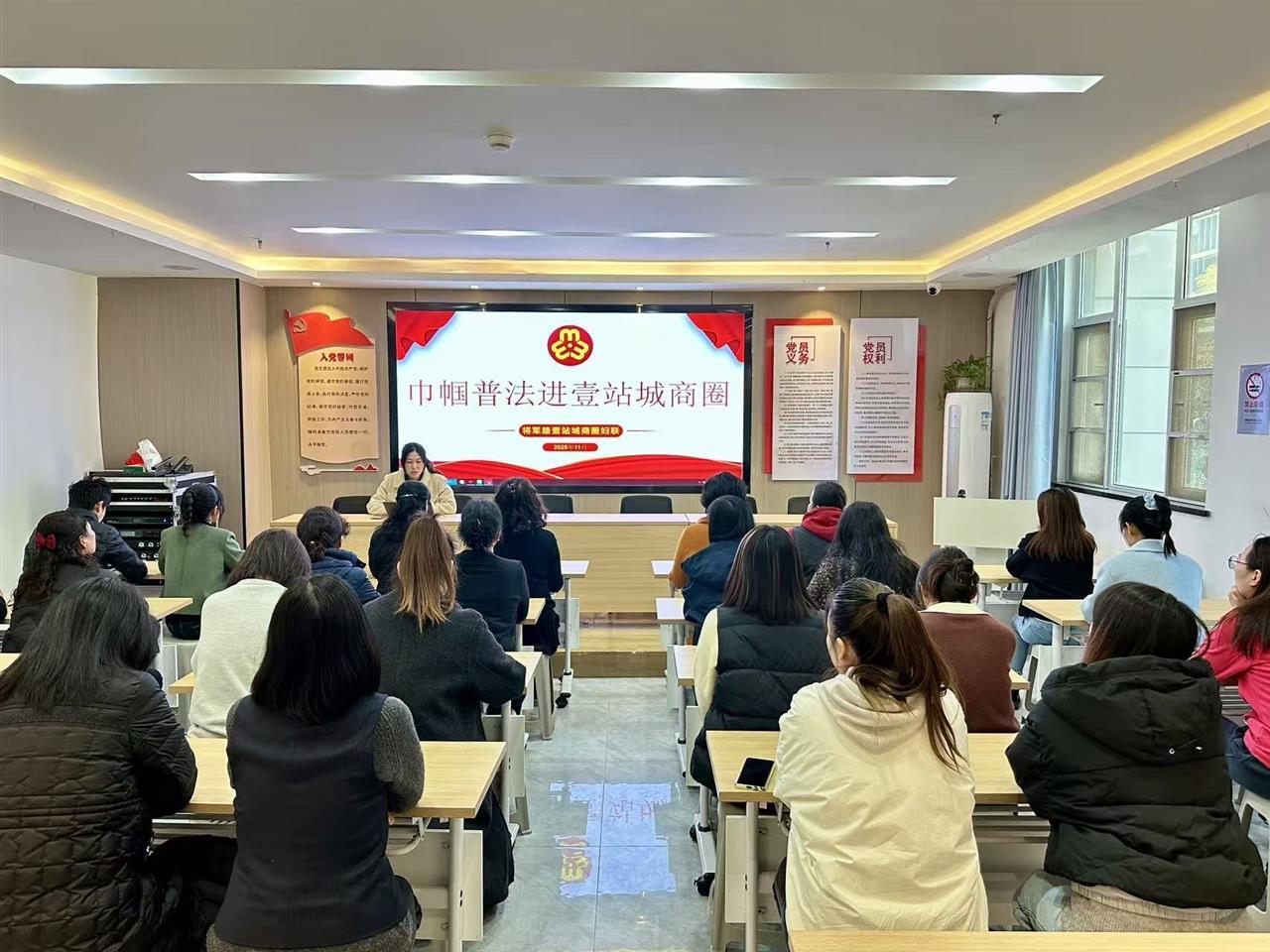 11月27日,武汉市东西湖区妇联在将军路街道刘家墩社区壹站城商圈举办巾帼普法进商圈活动,开展《妇女权益保障法》专题讲座。活动邀请专职律师李爱华担任主讲,为近30名商圈女性讲解相关法律知识。