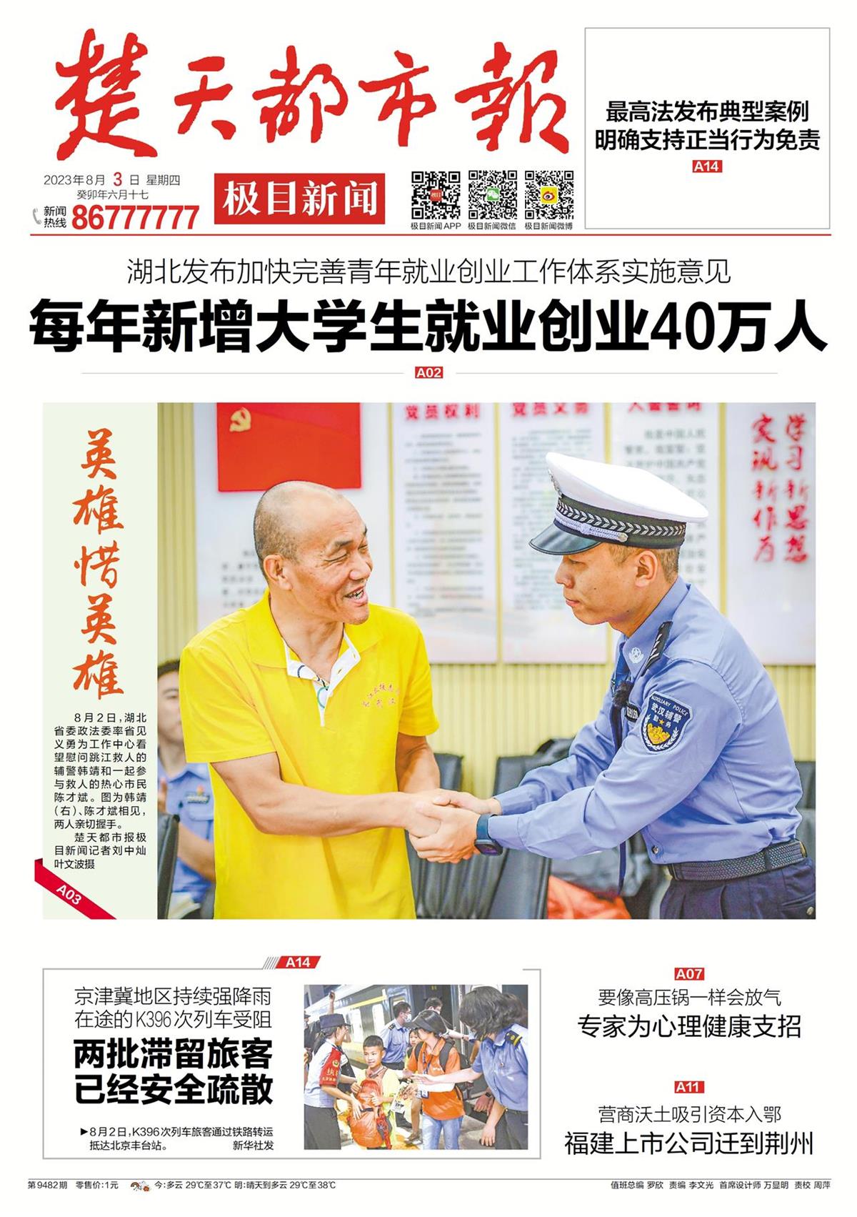 楚天都市报新闻运用“报、网、微、端”等全媒体手段,楚天都市报更是连续6天高规格、大篇幅报道英雄事迹,其中4次头版倒头条、1次头版大图、4次图文整版。第一条韩靖跳江救人的短视频在新闻微信视频号上播放量超过1500万次,点赞数超过10万,全国网友纷纷留言点赞。